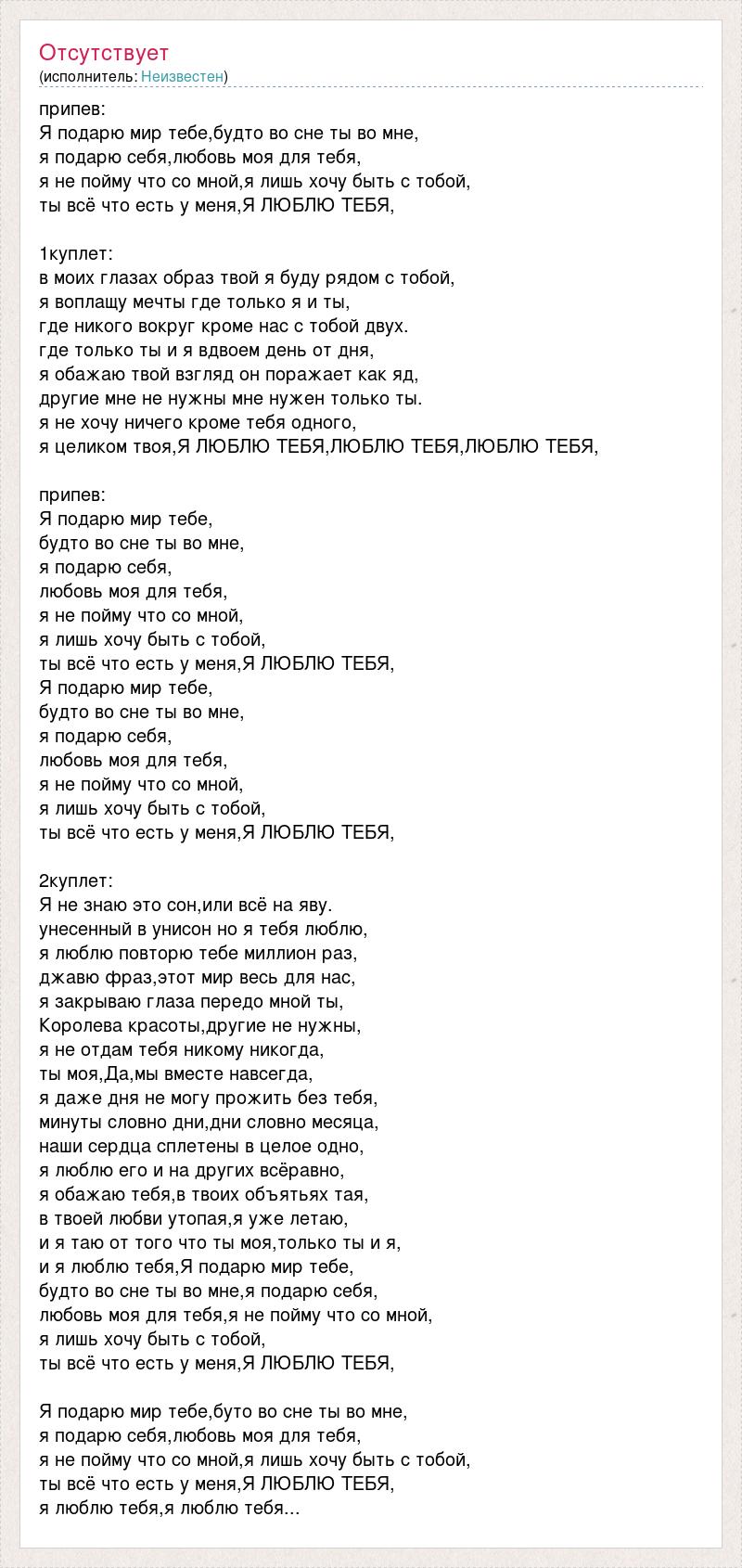 припев: Я подарю мир тебе,будто во сне ты во мне, я подарю себя,любовь моя для тебя, я не пойму что со мной,я лишь хочу быть с тобой, ты всё что есть у меня,Я ЛЮБЛЮ ТЕБЯ, 1куплет: в моих глазах образ твой я буду рядом с тобой, я воплащу мечты где только я и ты, где никого вокруг кроме нас с тобой двух. где только ты и я вдвоем день от дня, я обажаю твой взгляд он поражает как яд, другие мне не нужны мне нужен только ты. я не хочу ничего кроме тебя одного, я целиком твоя,Я ЛЮБЛЮ ТЕБЯ,ЛЮБЛЮ ТЕБЯ,ЛЮБЛЮ ТЕБЯ, припев: Я подарю мир тебе, будто во сне ты во мне, я подарю себя, любовь моя для тебя, я не пойму что со мной, я лишь хочу быть с тобой, ты всё что есть у меня,Я ЛЮБЛЮ ТЕБЯ, Я подарю мир тебе, будто во сне ты во мне, я подарю себя, любовь моя для тебя, я не пойму что со мной, я лишь хочу быть с тобой, ты всё что есть у меня,Я ЛЮБЛЮ ТЕБЯ, 2куплет: Я не знаю это сон,или всё на яву. унесенный в унисон но я тебя люблю, я люблю повторю тебе миллион раз, джавю фраз,этот мир весь для нас, я закрываю глаза передо мной ты, Королева красоты,другие не нужны, я не отдам тебя никому никогда, ты моя,Да,мы вместе навсегда, я даже дня не могу прожить без тебя, минуты словно дни,дни словно месяца, наши сердца сплетены в целое одно, я люблю его и на других всёравно, я обажаю тебя,в твоих объятьях тая, в твоей любви утопая,я уже летаю, и я таю от того что ты моя,только ты и я, и я люблю тебя,Я подарю мир тебе, будто во сне ты во мне,я подарю себя, любовь моя для тебя,я не пойму что со мной, я лишь хочу быть с тобой, ты всё что есть у меня,Я ЛЮБЛЮ ТЕБЯ, Я подарю мир тебе,буто во сне ты во мне, я подарю себя,любовь моя для тебя, я не пойму что со мной,я лишь хочу быть с тобой, ты всё что есть у меня,Я ЛЮБЛЮ ТЕБЯ, я люблю тебя,я люблю тебя...