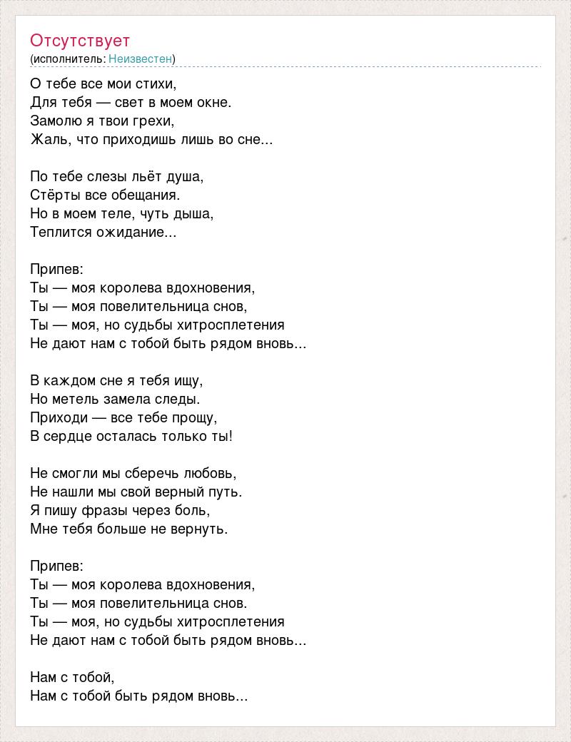 О тебе все мои стихи, Для тебя — свет в моем окне. Замолю я твои грехи, Жаль, что приходишь лишь во сне... По тебе слезы льёт душа, Стёрты все обещания. Но в моем теле, чуть дыша, Теплится ожидание... Припев: Ты — моя королева вдохновения, Ты — моя повелительница снов, Ты — моя, но судьбы хитросплетения Не дают нам с тобой быть рядом вновь... В каждом сне я тебя ищу, Но метель замела следы. Приходи — все тебе прощу, В сердце осталась только ты! Не смогли мы сберечь любовь, Не нашли мы свой верный путь. Я пишу фразы через боль, Мне тебя больше не вернуть. Припев: Ты — моя королева вдохновения, Ты — моя повелительница снов. Ты — моя, но судьбы хитросплетения Не дают нам с тобой быть рядом вновь... Нам с тобой, Нам с тобой быть рядом вновь...