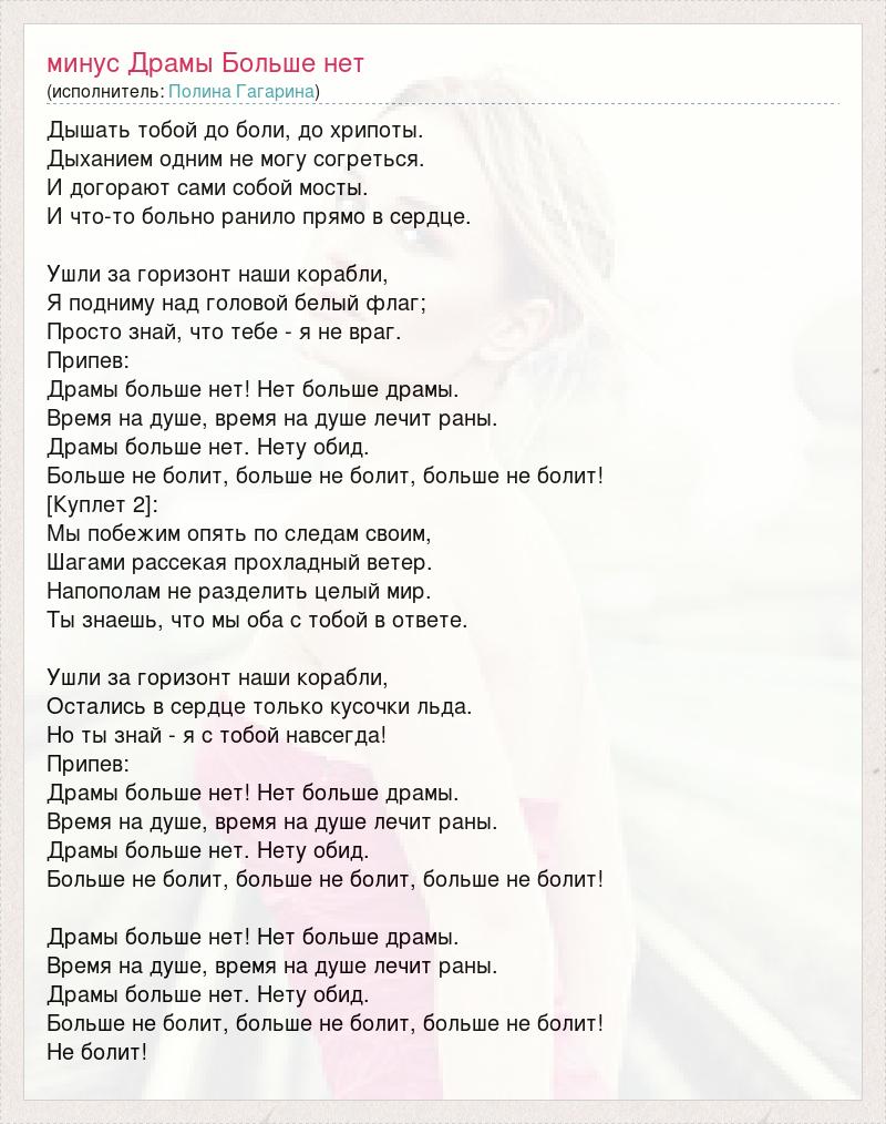 Дышать тобой до боли, до хрипоты. Дыханием одним не могу согреться. И догорают сами собой мосты. И что-то больно ранило прямо в сердце. Ушли за горизонт наши корабли, Я подниму над головой белый флаг; Просто знай, что тебе - я не враг. Припев: Драмы больше нет! Нет больше драмы. Время на душе, время на душе лечит раны. Драмы больше нет. Нету обид. Больше не болит, больше не болит, больше не болит! [Куплет 2]: Мы побежим опять по следам своим, Шагами рассекая прохладный ветер. Напополам не разделить целый мир. Ты знаешь, что мы оба с тобой в ответе. Ушли за горизонт наши корабли, Остались в сердце только кусочки льда. Но ты знай - я с тобой навсегда! Припев: Драмы больше нет! Нет больше драмы. Время на душе, время на душе лечит раны. Драмы больше нет. Нету обид. Больше не болит, больше не болит, больше не болит! Драмы больше нет! Нет больше драмы. Время на душе, время на душе лечит раны. Драмы больше нет. Нету обид. Больше не болит, больше не болит, больше не болит! Не болит!