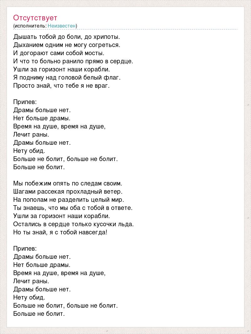 Дышать тобой до боли, до хрипоты. Дыханием одним не могу согреться. И догорают сами собой мосты. И что то больно ранило прямо в сердце. Ушли за горизонт наши корабли. Я подниму над головой белый флаг. Просто знай, что тебе я не враг. Припев: Драмы больше нет. Нет больше драмы. Время на душе, время на душе, Лечит раны. Драмы больше нет. Нету обид. Больше не болит, больше не болит. Больше не болит. Мы побежим опять по следам своим. Шагами рассекая прохладный ветер. На пополам не разделить целый мир. Ты знаешь, что мы оба с тобой в ответе. Ушли за горизонт наши корабли. Остались в сердце только кусочки льда. Но ты знай, я с тобой навсегда! Припев: Драмы больше нет. Нет больше драмы. Время на душе, время на душе, Лечит раны. Драмы больше нет. Нету обид. Больше не болит, больше не болит. Больше не болит.