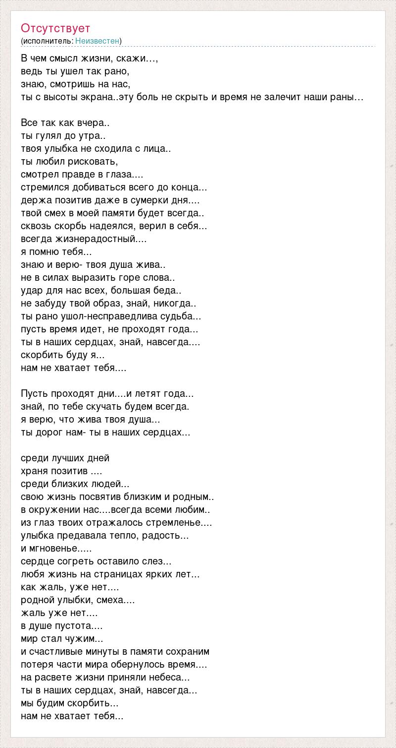 В чем смысл жизни, скажи…, ведь ты ушел так рано, знаю, смотришь на нас, ты с высоты экрана..эту боль не скрыть и время не залечит наши раны… Все так как вчера.. ты гулял до утра.. твоя улыбка не сходила с лица.. ты любил рисковать, смотрел правде в глаза.... стремился добиваться всего до конца... держа позитив даже в сумерки дня.... твой смех в моей памяти будет всегда.. сквозь скорбь надеялся, верил в себя... всегда жизнерадостный.... я помню тебя... знаю и верю- твоя душа жива.. не в силах выразить горе слова.. удар для нас всех, большая беда.. не забуду твой образ, знай, никогда.. ты рано ушол-несправедлива судьба... пусть время идет, не проходят года... ты в наших сердцах, знай, навсегда.... скорбить буду я... нам не хватает тебя.... Пусть проходят дни....и летят года... знай, по тебе скучать будем всегда. я верю, что жива твоя душа... ты дорог нам- ты в наших сердцах... среди лучших дней храня позитив .... среди близких людей... свою жизнь посвятив близким и родным.. в окружении нас....всегда всеми любим.. из глаз твоих отражалось стремленье.... улыбка предавала тепло, радость... и мгновенье..... сердце согреть оставило слез... любя жизнь на страницах ярких лет... как жаль, уже нет.... родной улыбки, смеха.... жаль уже нет.... в душе пустота.... мир стал чужим... и счастливые минуты в памяти сохраним потеря части мира обернулось время.... на расвете жизни приняли небеса... ты в наших сердцах, знай, навсегда... мы будим скорбить... нам не хватает тебя...
