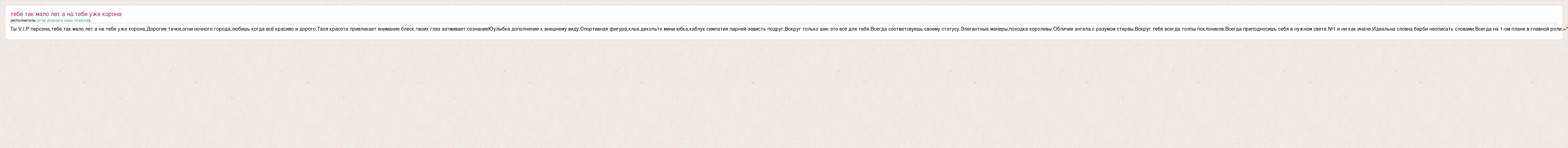 Главная→Исполнители→Неизвестен→Ты V.I.P персона,тебе так мало лет а на тебе уже корона,Дорогие тачки,огни