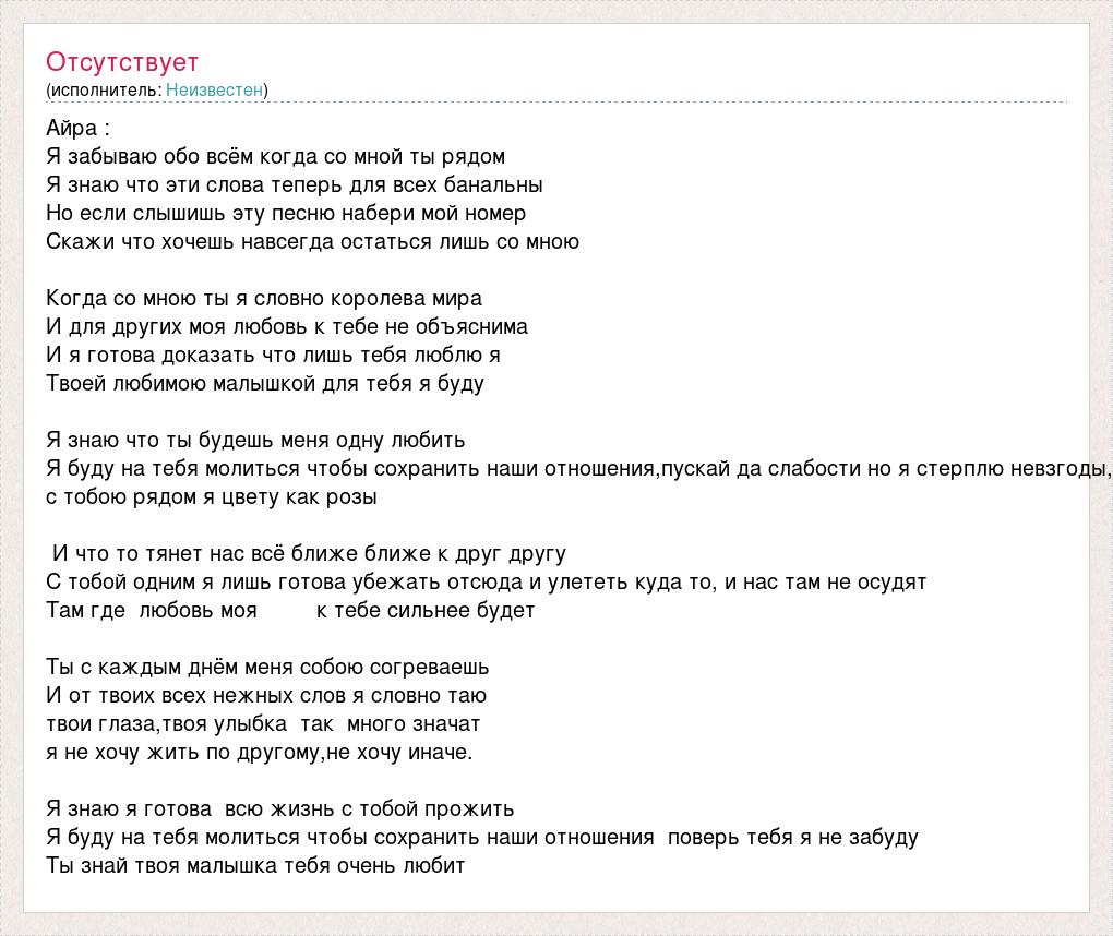 Айра : Я забываю обо всём когда со мной ты рядом Я знаю что эти слова теперь для всех банальны Но если слышишь эту песню набери мой номер Скажи что хочешь навсегда остаться лишь со мною Когда со мною ты я словно королева мира И для других моя любовь к тебе не объяснима И я готова доказать что лишь тебя люблю я Твоей любимою малышкой для тебя я буду Я знаю что ты будешь меня одну любить Я буду на тебя молиться чтобы сохранить наши отношения,пускай да слабости но я стерплю невзгоды, с тобою рядом я цвету как розы И что то тянет нас всё ближе ближе к друг другу С тобой одним я лишь готова убежать отсюда и улететь куда то, и нас там не осудят Там где любовь моя к тебе сильнее будет Ты с каждым днём меня собою согреваешь И от твоих всех нежных слов я словно таю твои глаза,твоя улыбка так много значат я не хочу жить по другому,не хочу иначе. Я знаю я готова всю жизнь с тобой прожить Я буду на тебя молиться чтобы сохранить наши отношения поверь тебя я не забуду Ты знай твоя малышка тебя очень любит