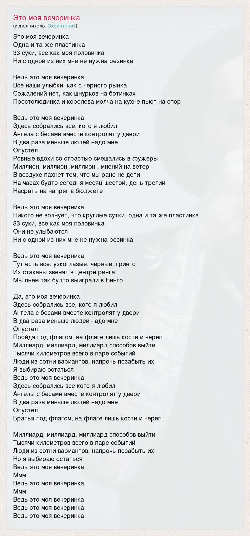 Это моя вечеринка Одна и та же пластинка 33 суки, все как моя половинка Ни с одной из них мне не нужна резинка Ведь это моя вечеринка Все наши улыбки, как с черного рынка Сожалений нет, как шнурков на ботинках Простолюдинка и королева молча на кухне пьют на спор Ведь это моя вечеринка Здесь собрались все, кого я любил Ангела с бесами вместе контролят у двери В два раза меньше людей надо мне Опустел Ровные вдохи со страстью смешались в фужеры Миллион, миллион ,миллион , мнений на ветер В воздухе пахнет тем, что мы рано не дети На часах будто сегодня месяц шестой, день третий Насрать на напряг в бюджете Ведь это моя вечерника Никого не волнует, что круглые сутки, одна и та же пластинка 33 суки, все как моя половинка Они не улыбаются Ни с одной из них мне не нужна резинка Ведь это моя вечерника Тут есть все: узкоглазые, черные, гринго Их стаканы звенят в центре ринга Мы пьем так будто выиграли в Бинго Да, это моя вечеринка Здесь собрались все, кого я любил Ангела с бесами вместе контролят у двери В два раза меньше людей надо мне Опустел Пройдя под флагом, на флаге лишь кости и череп Миллиард, миллиард, миллиард способов выйти Тысячи километров всего в паре событий Люди из сотни вариантов, напрочь позабыть их Я выбираю остаться Ведь это моя вечеринка Здесь собрались все кого я любил Ангелы с бесами вместе контролят у двери В два раза меньше людей надо мне Опустел Братья под флагом, на флаге лишь кости и череп Миллиард, миллиард, миллиард способов выйти Тысячи километров всего в паре событий Люди из сотни вариантов, напрочь позабыть их Но я выбираю остаться Ведь это моя вечеринка Ммм Ведь это моя вечеринка Ммм Ведь это моя вечеринка Ведь это моя вечеринка Ведь это моя вечеринка