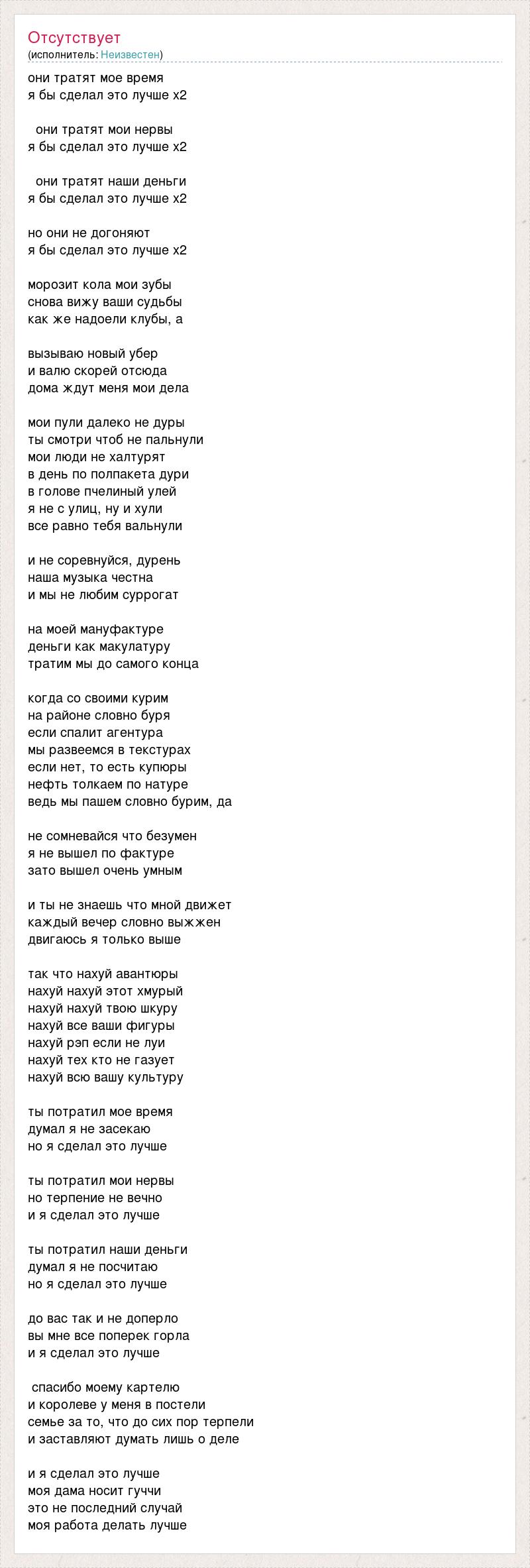 они тратят мое время я бы сделал это лучше x2 они тратят мои нервы я бы сделал это лучше x2 они тратят наши деньги я бы сделал это лучше x2 но они не догоняют я бы сделал это лучше x2 морозит кола мои зубы снова вижу ваши судьбы как же надоели клубы, а вызываю новый убер и валю скорей отсюда дома ждут меня мои дела мои пули далеко не дуры ты смотри чтоб не пальнули мои люди не халтурят в день по полпакета дури в голове пчелиный улей я не с улиц, ну и хули все равно тебя вальнули и не соревнуйся, дурень наша музыка честна и мы не любим суррогат на моей мануфактуре деньги как макулатуру тратим мы до самого конца когда со своими курим на районе словно буря если спалит агентура мы развеемся в текстурах если нет, то есть купюры нефть толкаем по натуре ведь мы пашем словно бурим, да не сомневайся что безумен я не вышел по фактуре зато вышел очень умным и ты не знаешь что мной движет каждый вечер словно выжжен двигаюсь я только выше так что нахуй авантюры нахуй нахуй этот хмурый нахуй нахуй твою шкуру нахуй все ваши фигуры нахуй рэп если не луи нахуй тех кто не газует нахуй всю вашу культуру ты потратил мое время думал я не засекаю но я сделал это лучше ты потратил мои нервы но терпение не вечно и я сделал это лучше ты потратил наши деньги думал я не посчитаю но я сделал это лучше до вас так и не доперло вы мне все поперек горла и я сделал это лучше спасибо моему картелю и королеве у меня в постели семье за то, что до сих пор терпели и заставляют думать лишь о деле и я сделал это лучше моя дама носит гуччи это не последний случай моя работа делать лучше