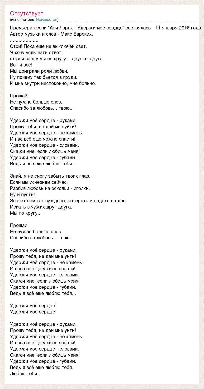 Премьера песни "Ани Лорак - Удержи моё сердце" состоялась - 11 января 2016 года. Автор музыки и слов - Макс Барских. .................... Стой! Пока еще не выключен свет. Я хочу услышать ответ. скажи зачем мы по кругу... друг от друга... Вот и всё! Мы доиграли роли любви. Ну почему так бьется в груди. И мне внутри неспокойно, мне больно. Прощай! Не нужно больше слов. Спасибо за любовь... твою... Удержи моё сердце - руками. Прошу тебя, не дай мне уйти! Удержи моё сердце - не камень. И нас всё еще можно спасти! Удержи мое сердце - словами. Скажи мне, если любишь меня! Удержи мое сердце - губами. Ведь я всё еще люблю тебя... Знай, я не смогу забыть твоих глаз. Если мы исчезнем сейчас. Разбив любовь на осколки - иголки. Ну и пусть! Значит нам так суждено, потерять и падать на дно. Искать в чужих друг друга. Мы по кругу... Прощай! Не нужно больше слов. Спасибо за любовь... твою... Удержи моё сердце - руками. Прошу тебя, не дай мне уйти! Удержи моё сердце - не камень. И нас всё еще можно спасти! Удержи мое сердце - словами. Скажи мне, если любишь меня! Удержи мое сердце - губами. Ведь я всё еще люблю тебя... Удержи моё сердце! Удержи моё сердце! Удержи моё сердце - руками. Прошу тебя, не дай мне уйти! Удержи моё сердце - не камень. И нас всё еще можно спасти! Удержи мое сердце - словами. Скажи мне, если любишь меня! Удержи мое сердце - губами. Ведь я всё еще люблю тебя. Люблю тебя...