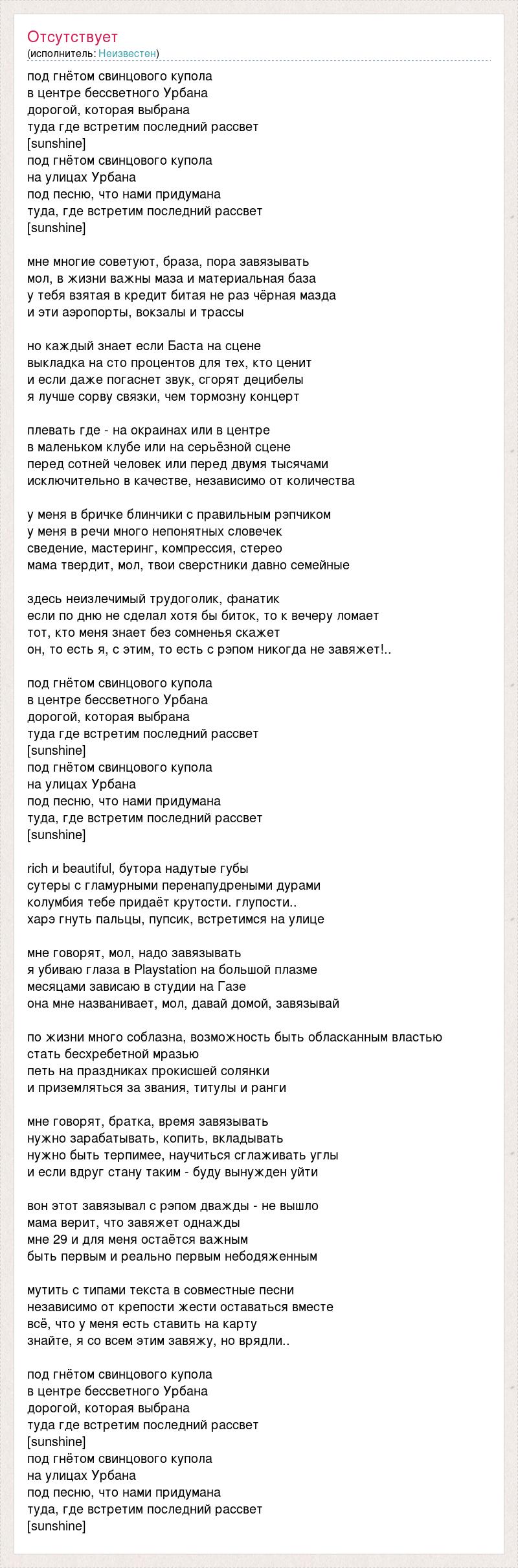 под гнётом свинцового купола в центре бессветного Урбана дорогой, которая выбрана туда где встретим последний рассвет [sunshine] под гнётом свинцового купола на улицах Урбана под песню, что нами придумана туда, где встретим последний рассвет [sunshine] мне многие советуют, браза, пора завязывать мол, в жизни важны маза и материальная база у тебя взятая в кредит битая не раз чёрная мазда и эти аэропорты, вокзалы и трассы но каждый знает если Баста на сцене выкладка на сто процентов для тех, кто ценит и если даже погаснет звук, сгорят децибелы я лучше сорву связки, чем тормозну концерт плевать где - на окраинах или в центре в маленьком клубе или на серьёзной сцене перед сотней человек или перед двумя тысячами исключительно в качестве, независимо от количества у меня в бричке блинчики с правильным рэпчиком у меня в речи много непонятных словечек сведение, мастеринг, компрессия, стерео мама твердит, мол, твои сверстники давно семейные здесь неизлечимый трудоголик, фанатик если по дню не сделал хотя бы биток, то к вечеру ломает тот, кто меня знает без сомненья скажет он, то есть я, с этим, то есть с рэпом никогда не завяжет!.. под гнётом свинцового купола в центре бессветного Урбана дорогой, которая выбрана туда где встретим последний рассвет [sunshine] под гнётом свинцового купола на улицах Урбана под песню, что нами придумана туда, где встретим последний рассвет [sunshine] rich и beautiful, бутора надутые губы сутеры с гламурными перенапудреными дурами колумбия тебе придаёт крутости. глупости.. харэ гнуть пальцы, пупсик, встретимся на улице мне говорят, мол, надо завязывать я убиваю глаза в Playstation на большой плазме месяцами зависаю в студии на Газе она мне названивает, мол, давай домой, завязывай по жизни много соблазна, возможность быть обласканным властью стать бесхребетной мразью петь на праздниках прокисшей солянки и приземляться за звания, титулы и ранги мне говорят, братка, время завязывать нужно зарабатывать, копить, вкладывать нужно быть терпимее, научиться сглаживать углы и если вдруг стану таким - буду вынужден уйти вон этот завязывал с рэпом дважды - не вышло мама верит, что завяжет однажды мне 29 и для меня остаётся важным быть первым и реально первым небодяженным мутить с типами текста в совместные песни независимо от крепости жести оставаться вместе всё, что у меня есть ставить на карту знайте, я со всем этим завяжу, но врядли.. под гнётом свинцового купола в центре бессветного Урбана дорогой, которая выбрана туда где встретим последний рассвет [sunshine] под гнётом свинцового купола на улицах Урбана под песню, что нами придумана туда, где встретим последний рассвет [sunshine]