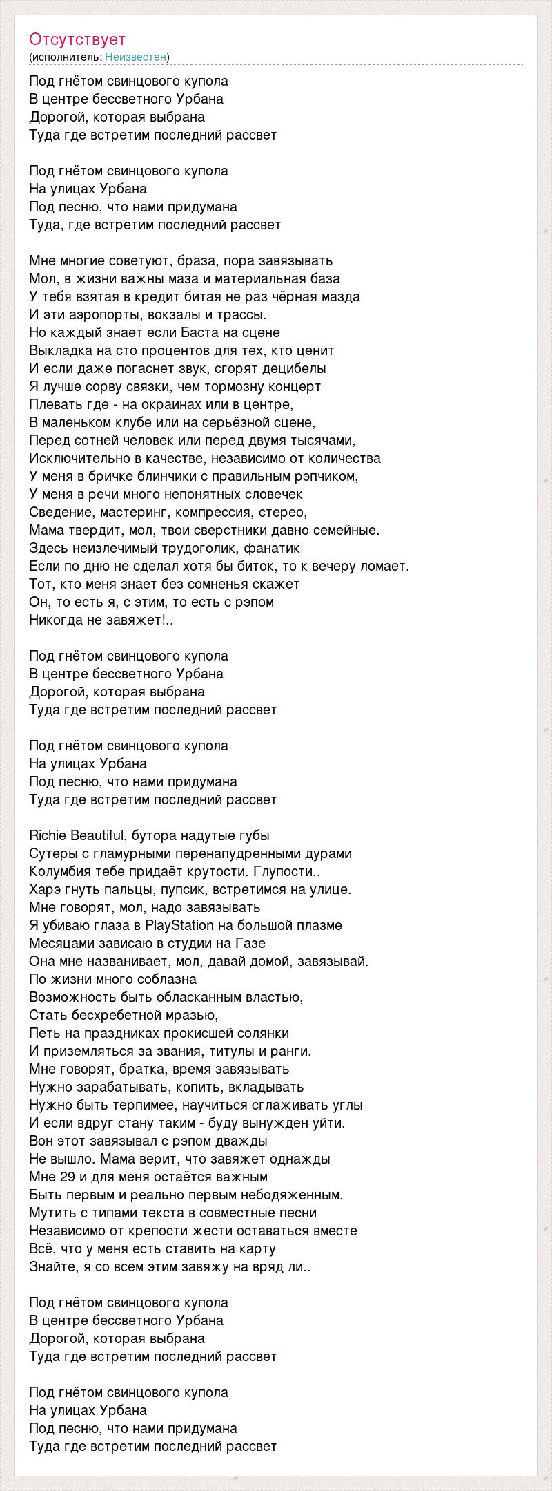 Под гнётом свинцового купола В центре бессветного Урбана Дорогой, которая выбрана Туда где встретим последний рассвет Под гнётом свинцового купола На улицах Урбана Под песню, что нами придумана Туда, где встретим последний рассвет Мне многие советуют, браза, пора завязывать Мол, в жизни важны маза и материальная база У тебя взятая в кредит битая не раз чёрная мазда И эти аэропорты, вокзалы и трассы. Но каждый знает если Баста на сцене Выкладка на сто процентов для тех, кто ценит И если даже погаснет звук, сгорят децибелы Я лучше сорву связки, чем тормозну концерт Плевать где - на окраинах или в центре, В маленьком клубе или на серьёзной сцене, Перед сотней человек или перед двумя тысячами, Исключительно в качестве, независимо от количества У меня в бричке блинчики с правильным рэпчиком, У меня в речи много непонятных словечек Сведение, мастеринг, компрессия, стерео, Мама твердит, мол, твои сверстники давно семейные. Здесь неизлечимый трудоголик, фанатик Если по дню не сделал хотя бы биток, то к вечеру ломает. Тот, кто меня знает без сомненья скажет Он, то есть я, с этим, то есть с рэпом Никогда не завяжет!.. Под гнётом свинцового купола В центре бессветного Урбана Дорогой, которая выбрана Туда где встретим последний рассвет Под гнётом свинцового купола На улицах Урбана Под песню, что нами придумана Туда где встретим последний рассвет Richie Beautiful, бутора надутые губы Сутеры с гламурными перенапудренными дурами Колумбия тебе придаёт крутости. Глупости.. Харэ гнуть пальцы, пупсик, встретимся на улице. Мне говорят, мол, надо завязывать Я убиваю глаза в PlayStation на большой плазме Месяцами зависаю в студии на Газе Она мне названивает, мол, давай домой, завязывай. По жизни много соблазна Возможность быть обласканным властью, Стать бесхребетной мразью, Петь на праздниках прокисшей солянки И приземляться за звания, титулы и ранги. Мне говорят, братка, время завязывать Нужно зарабатывать, копить, вкладывать Нужно быть терпимее, научиться сглаживать углы И если вдруг стану таким - буду вынужден уйти. Вон этот завязывал с рэпом дважды Не вышло. Мама верит, что завяжет однажды Мне 29 и для меня остаётся важным Быть первым и реально первым небодяженным. Мутить с типами текста в совместные песни Независимо от крепости жести оставаться вместе Всё, что у меня есть ставить на карту Знайте, я со всем этим завяжу на вряд ли.. Под гнётом свинцового купола В центре бессветного Урбана Дорогой, которая выбрана Туда где встретим последний рассвет Под гнётом свинцового купола На улицах Урбана Под песню, что нами придумана Туда где встретим последний рассвет