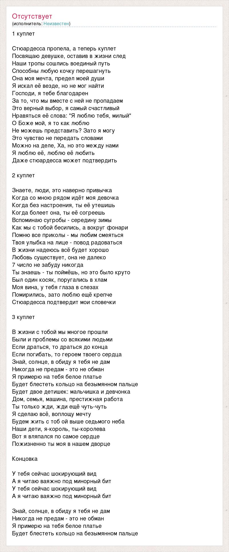 1 куплет Стюардесса пропела, а теперь куплет Посвящаю девушке, оставив в жизни след Наши тропы сошлись воединый путь Способны любую кочку перешагнуть Она моя мечта, предел моей души Я искал её везде, но не мог найти Господи, я тебе благодарен За то, что мы вместе с ней не пропадаем Это верный выбор, я самый счастливый Нравяться её слова: "Я люблю тебя, милый" О Боже мой, я то как люблю Не можешь представить? Зато я могу Это чувство не передать словами Можно на деле, Ха, но это между нами Я люблю её, люблю её любить Даже стюардесса может подтвердить 2 куплет Знаете, люди, это наверно привычка Когда со мною рядом идёт моя девочка Когда без настроения, ты её утешишь Когда болеет она, ты её согреешь Вспоминаю сугробы - середину зимы Как мы с тобой бесились, а вокруг фонари Помню все приколы - мы любим смеяться Твоя улыбка на лице - повод радоваться В жизни надеюсь всё будет хорошо Любовь существует, она не далеко 7 число не забуду никогда Ты знаешь - ты поймёшь, но это было круто Был один косяк, поругались в хлам Моя вина, у тебя глаза в слезах Помирились, зато люблю ещё крепче Стюардесса подтвердит мои словечки 3 куплет В жизни с тобой мы многое прошли Были и проблемы со всякими людьми Если драться, то драться до конца Если погибать, то героем твоего сердца Знай, солнце, в обиду я тебя не дам Никогда не предам - это не обман Я примерю на тебя белое платье Будет блестеть кольцо на безымянном пальце Будет двое детишек: мальчишка и девчонка Дом, семья, машина, престижная работа Ты только жди, жди ещё чуть-чуть Я сделаю всё, воплощу мечту Будем жить с тоб ой выше седьмого неба Наши дети, я-король, ты-королева Вот я вляпался по самое сердце Пожизненно ты моя в нашем дворце Концовка У тебя сейчас шокирующий вид А я читаю ваяжно под минорный бит У тебя сейчас шокирующий вид А я читаю ваяжно под минорный бит Знай, солнце, в обиду я тебя не дам Никогда не предам - это не обман Я примерю на тебя белое платье Будет блестеть кольцо на безымянном пальце