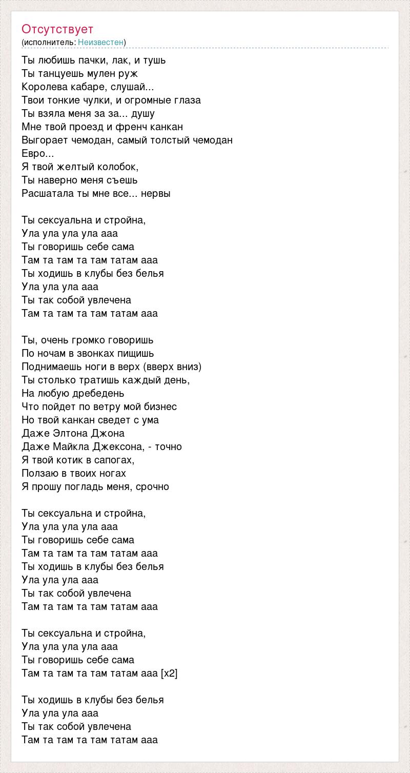 Ты любишь пачки, лак, и тушь Ты танцуешь мулен руж Королева кабаре, слушай... Твои тонкие чулки, и огромные глаза Ты взяла меня за за... душу Мне твой проезд и френч канкан Выгорает чемодан, самый толстый чемодан Евро... Я твой желтый колобок, Ты наверно меня съешь Расшатала ты мне все... нервы Ты сексуальна и стройна, Ула ула ула ула ааа Ты говоришь себе сама Там та там та там татам ааа Ты ходишь в клубы без белья Ула ула ула ааа Ты так собой увлечена Там та там та там татам ааа Ты, очень громко говоришь По ночам в звонках пищишь Поднимаешь ноги в верх (вверх вниз) Ты столько тратишь каждый день, На любую дребедень Что пойдет по ветру мой бизнес Но твой канкан сведет с ума Даже Элтона Джона Даже Майкла Джексона, - точно Я твой котик в сапогах, Ползаю в твоих ногах Я прошу погладь меня, срочно Ты сексуальна и стройна, Ула ула ула ула ааа Ты говоришь себе сама Там та там та там татам ааа Ты ходишь в клубы без белья Ула ула ула ааа Ты так собой увлечена Там та там та там татам ааа Ты сексуальна и стройна, Ула ула ула ула ааа Ты говоришь себе сама Там та там та там татам ааа [x2] Ты ходишь в клубы без белья Ула ула ула ааа Ты так собой увлечена Там та там та там татам ааа