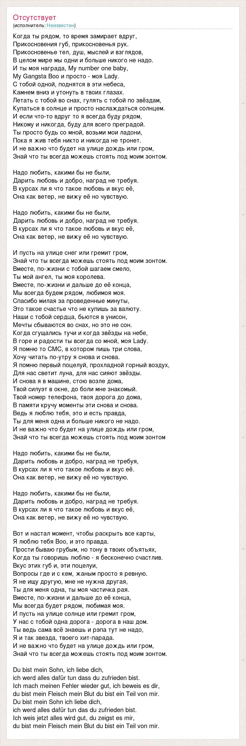 Когда ты рядом, то время замирает вдруг, Прикосновения губ, прикосновенья рук. Прикосновенье тел, душ, мыслей и взглядов, В целом мире мы одни и больше никого не надо. И ты моя награда, My number one baby, My Gangsta Boo и просто - моя Lady. С тобой одной, поднятся в эти небеса, Камнем вниз и утонуть в твоих глазах. Летать с тобой во снах, гулять с тобой по звёздам, Купаться в солнце и просто наслаждаться солнцем. И если что-то вдруг то я всегда буду рядом, Никому и никогда, буду для всего преградой. Ты просто будь со мной, возьми мои ладони, Пока я жив тебя никто и никогда не тронет. И не важно что будет на улице дождь или гром, Знай что ты всегда можешь стоять под моим зонтом. Надо любить, какими бы не были, Дарить любовь и добро, наград не требуя. В курсах ли я что такое любовь и вкус её, Она как ветер, не вижу её но чувствую. Надо любить, какими бы не были, Дарить любовь и добро, наград не требуя. В курсах ли я что такое любовь и вкус её, Она как ветер, не вижу её но чувствую. И пусть на улице снег или гремит гром, Знай что ты всегда можешь стоять под моим зонтом. Вместе, по-жизни с тобой шагаем смело, Ты мой ангел, ты моя королева. Вместе, по-жизни и дальше до её конца, Мы всегда будем рядом, любимоя моя. Спасибо милая за проведенные минуты, Это такое счастье что не купишь за валюту. Наши с тобой сердца, бьются в унисон, Мечты сбываются во снах, но это не сон. Когда сгущались тучи и когда звёзды на небе, В горе и радости ты всегда со мной, моя Lady. Я помню то СМС, в котором лишь три слова, Хочу читать по-утру я снова и снова. Я помню первый поцелуй, прохладной горный воздух, Для нас светит луна, для нас сияют звёзды. И снова я в машине, стою возле дома, Твой силуэт в окне, до боли мне знакомый. Твой номер телефона, твоя дорога до дома, В памяти кручу моменты эти снова и снова. Ведь я люблю тебя, это и есть правда, Ты для меня одна и больше никого не надо. И не важно что будет на улице дождь или гром, Знай что ты всегда можешь стоять под моим зонтом Надо любить, какими бы не были, Дарить любовь и добро, наград не требуя, В курсах ли я что такое любовь и вкус её. Она как ветер, не вижу её но чувствую. Надо любить, какими бы не были, Дарить любовь и добро, наград не требуя. В курсах ли я что такое любовь и вкус её, Она как ветер, не вижу её но чувствую. Вот и настал момент, чтобы раскрыть все карты, Я люблю тебя Boo, и это правда. Прости бываю грубым, но тону в твоих объятьях, Когда ты говоришь люблю - я бесконечно счастлив. Вкус этих губ и, эти поцелуи, Вопросы где и с кем, жаным просто я ревную. Я не ищу другую, мне не нужна другая, Ты для меня одна, ты моя частичка рая. Вместе, по-жизни и дальше до её конца, Мы всегда будет рядом, любимая моя. И пусть на улице солнце или гремит гром, У нас с тобой одна дорога - дорога в наш дом. Ты ведь сама всё знаешь и рэпа тут не надо, Я и так звезда, твоего хит-парада. И не важно что будет на улице дождь или гром, Знай что ты всегда можешь стоять под моим зонтом. Du bist mein Sohn, ich liebe dich, ich werd alles dafür tun dass du zufrieden bist. Ich mach meinen Fehler wieder gut, ich beweis es dir, du bist mein Fleisch mein Blut du bist ein Teil von mir. Du bist mein Sohn ich liebe dich, ich werd alles dafür tun das du zufrieden bist. Ich weis jetzt alles wird gut, du zeigst es mir, du bist mein Fleisch mein Blut du bist ein Teil von mir.