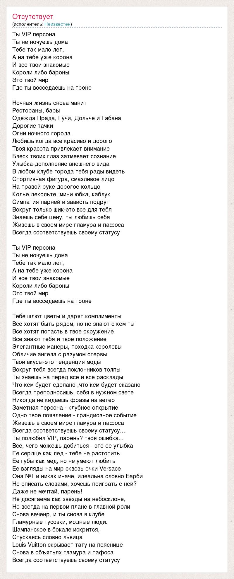 Ты VIP персона Ты не ночуешь дома Тебе так мало лет, А на тебе уже корона И все твои знакомые Короли либо бароны Это твой мир Где ты восседаешь на троне Ночная жизнь снова манит Рестораны, бары Одежда Прада, Гучи, Дольче и Габана Дорогие тачки Огни ночного города Любишь когда все красиво и дорого Твоя красота привлекает внимание Блеск твоих глаз затмевает сознание Улыбка-дополнение внешнего вида В любом клубе города тебя рады видеть Спортивная фигура, смазливое лицо На правой руке дорогое кольцо Колье,декольте, мини юбка, каблук Симпатия парней и зависть подруг Вокруг только шик-это все для тебя Знаешь себе цену, ты любишь себя Живешь в своем мире гламура и пафоса Всегда соответствуешь своему статусу Ты VIP персона Ты не ночуешь дома Тебе так мало лет, А на тебе уже корона И все твои знакомые Короли либо бароны Это твой мир Где ты восседаешь на троне Тебе шлют цветы и дарят комплименты Все хотят быть рядом, но не знают с кем ты Все хотят попасть в твое окружение Все знают тебя и твое положение Элегантные манеры, походка королевы Обличие ангела с разумом стервы Твои вкусы-это тенденция моды Вокруг тебя всегда поклонников толпы Ты знаешь на перед всё и все расклады Что кем будет сделано ,что кем будет сказано Всегда преподносишь, себя в нужном свете Никогда не кидаешь фразы на ветер Заметная персона - клубное открытие Одно твое появление - грандиозное событие Живешь в своем мире гламура и пафоса Всегда соответствуешь своему статусу.... Ты полюбил VIP, парень? твоя ошибка... Все, чего можешь добиться - это ее улыбка Ее сердце как лед - тебе не растопить Ее губы как мед, но не умеют любить Ее взгляды на мир сквозь очки Versace Она №1 и никак иначе, идеальна словно Барби Не описать словами, хочешь поиграть с ней? Даже не мечтай, парень! Не досягаема как звёзды на небосклоне, Но всегда на первом плане в главной роли Снова веченр, и ты снова в клубе Гламурные тусовки, модные люди. Шампанское в бокале искрится, Спускаясь словно львица Louis Vuitton скрывает тату на пояснице Снова в объятьях гламура и пафоса Всегда соответствуешь своему статусу