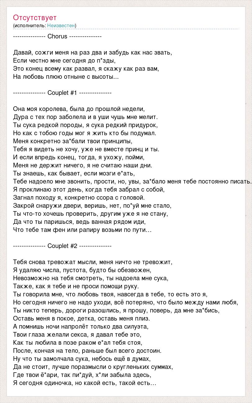 --------------- Chorus --------------- Давай, сожги меня на раз два и забудь как нас звать, Если честно мне сегодня до п*зды, Это конец всему как развал, я скажу как раз вам, На любовь плюю отныне с высоты... --------------- Сouplet #1 --------------- Она моя королева, была до прошлой недели, Дура с тех пор заболела и в уши чушь мне мелит. Ты сука редкой породы, я сука редкий придурок, Но как с тобою годы мог я жить кто бы подумал. Меня конкретно за*бали твои принципы, Тебя я видеть не хочу, уже не вместе принц и ты. И если впредь конец, тогда, я ухожу, пойми, Меня не держит ничего, я не считаю наши дни. Ты знаешь, как бывает, если мозги е*ать, Тебе надоело мне звонить, прости, но, увы, за*бало меня тебе постоянно писать. Я проклинаю этот день, когда тебя забрал с собой, Загнал походу я, конкретно ссора с головой. Закрой снаружи двери, веришь, нет, по*уй мне стало, Ты что-то хочешь проверить, другим уже я не стану, Да что ты паришься, ведь ванная рядом иди, Что тебе там фен или рапиру возьми по пути… --------------- Сouplet #2 --------------- Тебя снова тревожат мысли, меня ничто не тревожит, Я удаляю числа, пустота, будто бы обезвожен, Невозможно на тебя смотреть, ты надоела мне сука, Также, как я тебе и не проси помощи руку. Ты говорила мне, что любовь твоя, навсегда в тебе, то есть это я, Но сегодня ничего не надо уходи, всё потеряно, что было между нами любя, Ты никто теперь, дороги разошлись, я прошу, поверь, да мне за*бись, Оставь меня в покое, детка, оставь меня плиз. А помнишь ночи напролёт только два силуэта, Твои глаза желали секса, я давал тебе это, Как ты любила в позе раком е*ал тебя стоя, После, кончая на тело, раньше был всего достоин. Ну что ты замолчала сука, небось ещё в думах, Да не стоит, лучше поразмысли о кругленьких суммах, Где твои ё*ари, так пи*дуй, х*ли забыла здесь, Я сегодня одиночка, но какой есть, такой есть…
