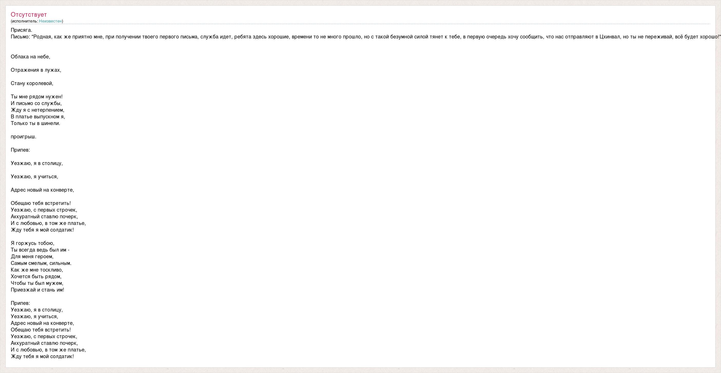 Присяга. Письмо: "Родная, как же приятно мне, при получении твоего первого письма, служба идет, ребята здесь хорошие, времени то не много прошло, но с такой безумной силой тянет к тебе, в первую очередь хочу сообщить, что нас отправляют в Цхинвал, но ты не переживай, всё будет хорошо!" Облака на небе, Отражения в лужах, Стану королевой, Ты мне рядом нужен! И письмо со службы, Жду я с нетерпением, В платье выпускном я, Только ты в шинели. проигрыш. Припев: Уезжаю, я в столицу, Уезжаю, я учиться, Адрес новый на конверте, Обещаю тебя встретить! Уезжаю, с первых строчек, Аккуратный ставлю почерк, И с любовью, в том же платье, Жду тебя я мой солдатик! Я горжусь тобою, Ты всегда ведь был им - Для меня героем, Самым смелым, сильным. Как же мне тоскливо, Хочется быть рядом, Чтобы ты был мужем, Приезжай и стань им! Припев: Уезжаю, я в столицу, Уезжаю, я учиться, Адрес новый на конверте, Обещаю тебя встретить! Уезжаю, с первых строчек, Аккуратный ставлю почерк, И с любовью, в том же платье, Жду тебя я мой солдатик!