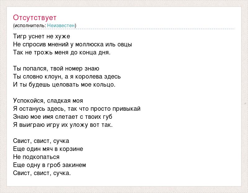 Тигр уснет не хуже Не спросив мнений у моллюска иль овцы Так не трожь меня до конца дня. Ты попался, твой номер знаю Ты словно клоун, а я королева здесь И ты будешь целовать мое кольцо. Успокойся, сладкая моя Я останусь здесь, так что просто привыкай Знаю мое имя слетает с твоих губ Я выиграю игру их уложу вот так. Свист, свист, сучка Еще один мяч в корзине Не подкопаться Еще одну в гроб закинем Свист, свист, сучка.