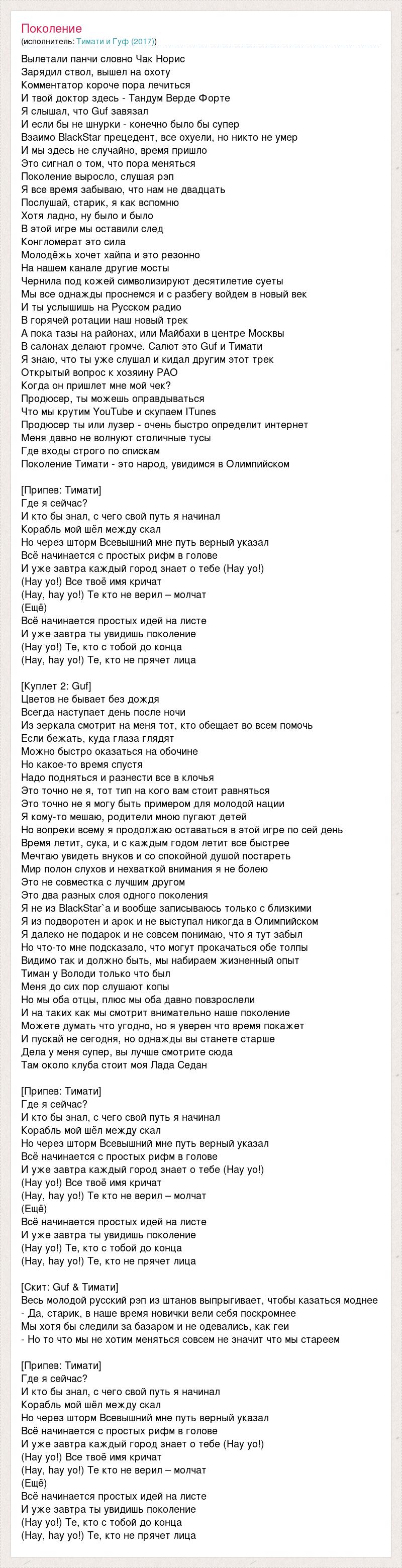 Вылетали панчи словно Чак Норис Зарядил ствол, вышел на охоту Комментатор короче пора лечиться И твой доктор здесь - Тандум Верде Форте Я слышал, что Guf завязал И если бы не шнурки - конечно было бы супер Взаимо BlackStar прецедент, все охуели, но никто не умер И мы здесь не случайно, время пришло Это сигнал о том, что пора меняться Поколение выросло, слушая рэп Я все время забываю, что нам не двадцать Послушай, старик, я как вспомню Хотя ладно, ну было и было В этой игре мы оставили след Конгломерат это сила Молодёжь хочет хайпа и это резонно На нашем канале другие мосты Чернила под кожей символизируют десятилетие суеты Мы все однажды проснемся и с разбегу войдем в новый век И ты услышишь на Русском радио В горячей ротации наш новый трек А пока тазы на районах, или Майбахи в центре Москвы В салонах делают громче. Салют это Guf и Тимати Я знаю, что ты уже слушал и кидал другим этот трек Открытый вопрос к хозяину РАО Когда он пришлет мне мой чек? Продюсер, ты можешь оправдываться Что мы крутим YouTube и скупаем ITunes Продюсер ты или лузер - очень быстро определит интернет Меня давно не волнуют столичные тусы Где входы строго по спискам Поколение Тимати - это народ, увидимся в Олимпийском [Припев: Тимати] Где я сейчас? И кто бы знал, с чего свой путь я начинал Корабль мой шёл между скал Но через шторм Всевышний мне путь верный указал Всё начинается с простых рифм в голове И уже завтра каждый город знает о тебе (Hay yo!) (Hay yo!) Все твоё имя кричат (Hay, hay yo!) Те кто не верил – молчат (Ещё) Всё начинается простых идей на листе И уже завтра ты увидишь поколение (Hay yo!) Те, кто с тобой до конца (Hay, hay yo!) Те, кто не прячет лица [Куплет 2: Guf] Цветов не бывает без дождя Всегда наступает день после ночи Из зеркала смотрит на меня тот, кто обещает во всем помочь Если бежать, куда глаза глядят Можно быстро оказаться на обочине Но какое-то время спустя Надо подняться и разнести все в клочья Это точно не я, тот тип на кого вам стоит равняться Это точно не я могу быть примером для молодой нации Я кому-то мешаю, родители мною пугают детей Но вопреки всему я продолжаю оставаться в этой игре по сей день Время летит, сука, и с каждым годом летит все быстрее Мечтаю увидеть внуков и со спокойной душой постареть Мир полон слухов и нехваткой внимания я не болею Это не совместка с лучшим другом Это два разных слоя одного поколения Я не из BlackStar`а и вообще записываюсь только с близкими Я из подворотен и арок и не выступал никогда в Олимпийском Я далеко не подарок и не совсем понимаю, что я тут забыл Но что-то мне подсказало, что могут прокачаться обе толпы Видимо так и должно быть, мы набираем жизненный опыт Тиман у Володи только что был Меня до сих пор слушают копы Но мы оба отцы, плюс мы оба давно повзрослели И на таких как мы смотрит внимательно наше поколение Можете думать что угодно, но я уверен что время покажет И пускай не сегодня, но однажды вы станете старше Дела у меня супер, вы лучше смотрите сюда Там около клуба стоит моя Лада Седан [Припев: Тимати] Где я сейчас? И кто бы знал, с чего свой путь я начинал Корабль мой шёл между скал Но через шторм Всевышний мне путь верный указал Всё начинается с простых рифм в голове И уже завтра каждый город знает о тебе (Hay yo!) (Hay yo!) Все твоё имя кричат (Hay, hay yo!) Те кто не верил – молчат (Ещё) Всё начинается простых идей на листе И уже завтра ты увидишь поколение (Hay yo!) Те, кто с т