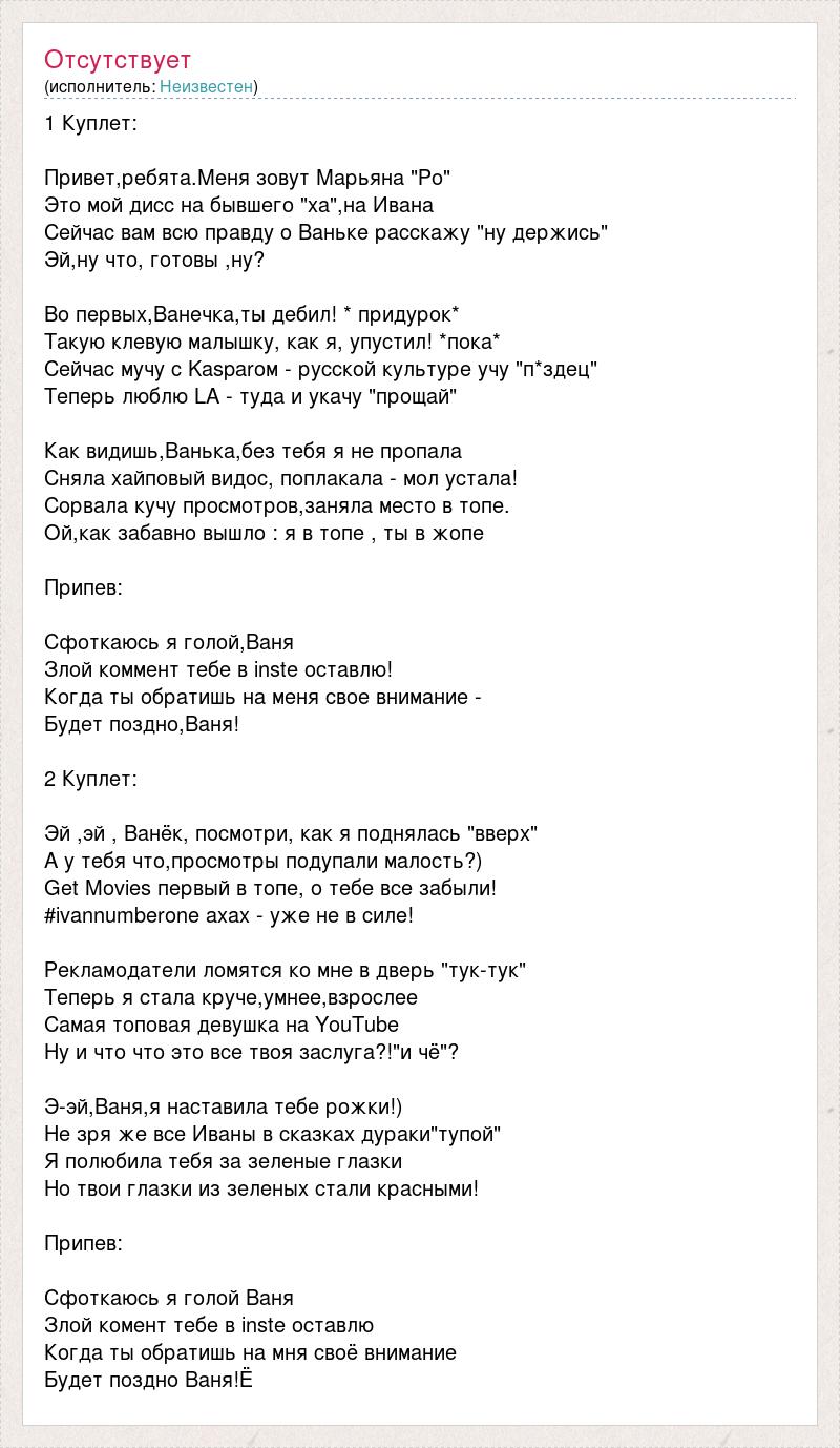 1 Куплет: Привет,ребята.Меня зовут Марьяна "Ро" Это мой дисс на бывшего "ха",на Ивана Сейчас вам всю правду о Ваньке расскажу "ну держись" Эй,ну что, готовы ,ну? Во первых,Ванечка,ты дебил! * придурок* Такую клевую малышку, как я, упустил! *пока* Сейчас мучу с Kasparом - русской культуре учу "п*здец" Теперь люблю LA - туда и укачу "прощай" Как видишь,Ванька,без тебя я не пропала Сняла хайповый видос, поплакала - мол устала! Сорвала кучу просмотров,заняла место в топе. Ой,как забавно вышло : я в топе , ты в жопе Припев: Сфоткаюсь я голой,Ваня Злой коммент тебе в inste оставлю! Когда ты обратишь на меня свое внимание - Будет поздно,Ваня! 2 Куплет: Эй ,эй , Ванёк, посмотри, как я поднялась "вверх" А у тебя что,просмотры подупали малость?) Get Movies первый в топе, о тебе все забыли! #ivannumberone ахах - уже не в силе! Рекламодатели ломятся ко мне в дверь "тук-тук" Теперь я стала круче,умнее,взрослее Самая топовая девушка на YouTube Ну и что что это все твоя заслуга?!"и чё"? Э-эй,Ваня,я наставила тебе рожки!) Не зря же все Иваны в сказках дураки"тупой" Я полюбила тебя за зеленые глазки Но твои глазки из зеленых стали красными! Припев: Сфоткаюсь я голой Ваня Злой комент тебе в inste оставлю Когда ты обратишь на мня своё внимание Будет поздно Ваня!Ё