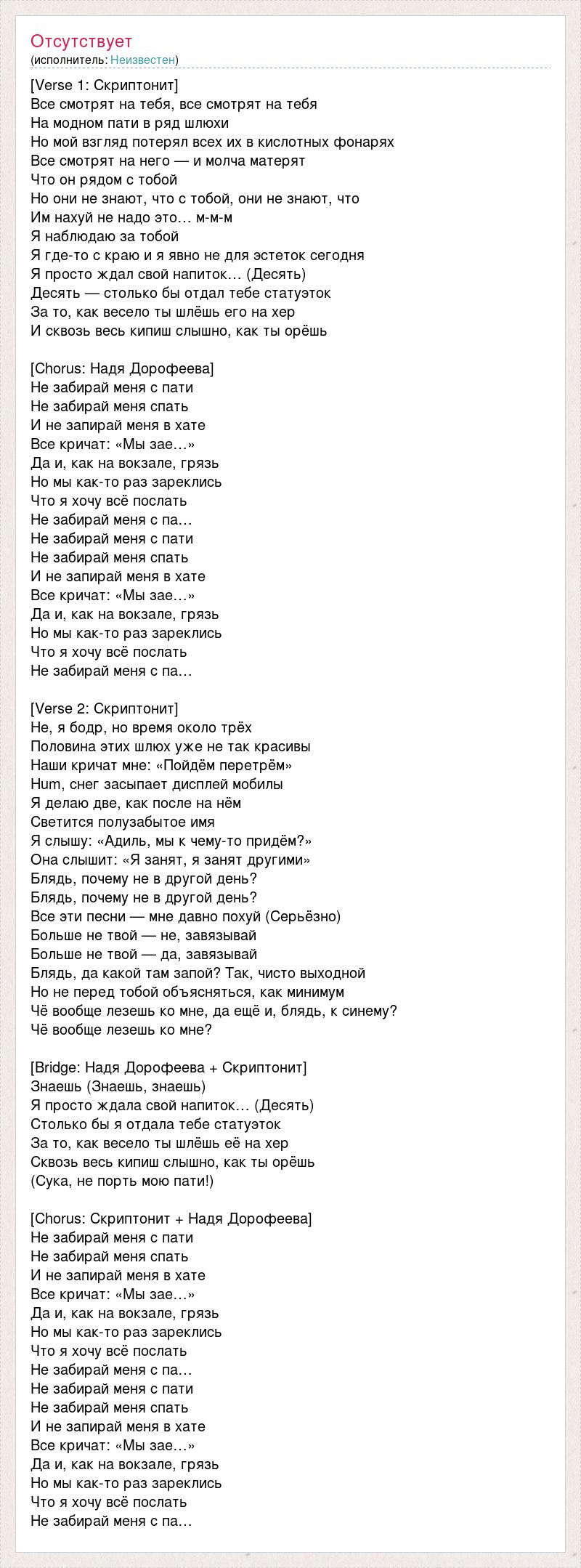 [Verse 1: Скриптонит] Все смотрят на тебя, все смотрят на тебя На модном пати в ряд шлюхи Но мой взгляд потерял всех их в кислотных фонарях Все смотрят на него — и молча матерят Что он рядом с тобой Но они не знают, что с тобой, они не знают, что Им нахуй не надо это… м-м-м Я наблюдаю за тобой Я где-то с краю и я явно не для эстеток сегодня Я просто ждал свой напиток… (Десять) Десять — столько бы отдал тебе статуэток За то, как весело ты шлёшь его на хер И сквозь весь кипиш слышно, как ты орёшь [Chorus: Надя Дорофеева] Не забирай меня с пати Не забирай меня спать И не запирай меня в хате Все кричат: «Мы зае…» Да и, как на вокзале, грязь Но мы как-то раз зареклись Что я хочу всё послать Не забирай меня с па… Не забирай меня с пати Не забирай меня спать И не запирай меня в хате Все кричат: «Мы зае…» Да и, как на вокзале, грязь Но мы как-то раз зареклись Что я хочу всё послать Не забирай меня с па… [Verse 2: Скриптонит] Не, я бодр, но время около трёх Половина этих шлюх уже не так красивы Наши кричат мне: «Пойдём перетрём» Hum, снег засыпает дисплей мобилы Я делаю две, как после на нём Светится полузабытое имя Я слышу: «Адиль, мы к чему-то придём?» Она слышит: «Я занят, я занят другими» Блядь, почему не в другой день? Блядь, почему не в другой день? Все эти песни — мне давно похуй (Серьёзно) Больше не твой — не, завязывай Больше не твой — да, завязывай Блядь, да какой там запой? Так, чисто выходной Но не перед тобой объясняться, как минимум Чё вообще лезешь ко мне, да ещё и, блядь, к синему? Чё вообще лезешь ко мне? [Bridge: Надя Дорофеева + Скриптонит] Знаешь (Знаешь, знаешь) Я просто ждала свой напиток… (Десять) Столько бы я отдала тебе статуэток За то, как весело ты шлёшь её на хер Сквозь весь кипиш слышно, как ты орёшь (Сука, не порть мою пати!) [Chorus: Скриптонит + Надя Дорофеева] Не забирай меня с пати Не забирай меня спать И не запирай меня в хате Все кричат: «Мы зае…» Да и, как на вокзале, грязь Но мы как-то раз зареклись Что я хочу всё послать Не забирай меня с па… Не забирай меня с пати Не забирай меня спать И не запирай меня в хате Все кричат: «Мы зае…» Да и, как на вокзале, грязь Но мы как-то раз зареклись Что я хочу всё послать Не забирай меня с па…