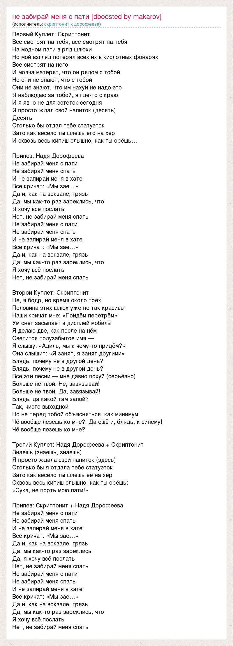 Первый Куплет: Скриптонит Все смотрят на тебя, все смотрят на тебя На модном пати в ряд шлюхи Но мой взгляд потерял всех их в кислотных фонарях Все смотрят на него И молча матерят, что он рядом с тобой Но они не знают, что с тобой Они не знают, что им нахуй не надо это Я наблюдаю за тобой, я где-то с краю И я явно не для эстеток сегодня Я просто ждал свой напиток (десять) Десять Столько бы отдал тебе статуэток Зато как весело ты шлёшь его на хер И сквозь весь кипиш слышно, как ты орёшь… Припев: Надя Дорофеева Не забирай меня с пати Не забирай меня спать И не запирай меня в хате Все кричат: «Мы зае…» Да и, как на вокзале, грязь Да, мы как-то раз зареклись, что Я хочу всё послать Нет, не забирай меня спать Не забирай меня с пати Не забирай меня спать И не запирай меня в хате Все кричат: «Мы зае…» Да и, как на вокзале, грязь Да, мы как-то раз зареклись, что Я хочу всё послать Нет, не забирай меня спать Второй Куплет: Скриптонит Не, я бодр, но время около трёх Половина этих шлюх уже не так красивы Наши кричат мне: «Пойдём перетрём» Ум снег засыпает в дисплей мобилы Я делаю две, как после на нём Светится полузабытое имя — Я слышу: «Адиль, мы к чему-то придём?» Она слышит: «Я занят, я занят другими» Блядь, почему не в другой день? Блядь, почему не в другой день? Все эти песни — мне давно похуй (серьёзно) Больше не твой. Не, завязывай! Больше не твой. Да, завязывай! Блядь, да какой там запой? Так, чисто выходной Но не перед тобой объясняться, как минимум Чё вообще лезешь ко мне?! Да ещё и, блядь, к синему! Чё вообще лезешь ко мне? Третий Куплет: Надя Дорофеева + Скриптонит Знаешь (знаешь, знаешь) Я просто ждала свой напиток (здесь) Столько бы я отдала тебе статуэток Зато как весело ты шлёшь её на хер Сквозь весь кипиш слышно, как ты орёшь: «Сука, не порть мою пати!» Припев: Скриптонит + Надя Дорофеева Не забирай меня с пати Не забирай меня спать И не запирай меня в хате Все кричат: «Мы зае…» Да и, как на вокзале, грязь Да, мы как-то раз зареклись Да, я хочу всё послать Нет, не забирай меня спать Не забирай меня с пати Не забирай меня спать И не запирай меня в хате Все кричат: «Мы зае…» Да и, как на вокзале, грязь Да, мы как-то раз зареклись, что Я хочу всё послать Нет, не забирай меня спать