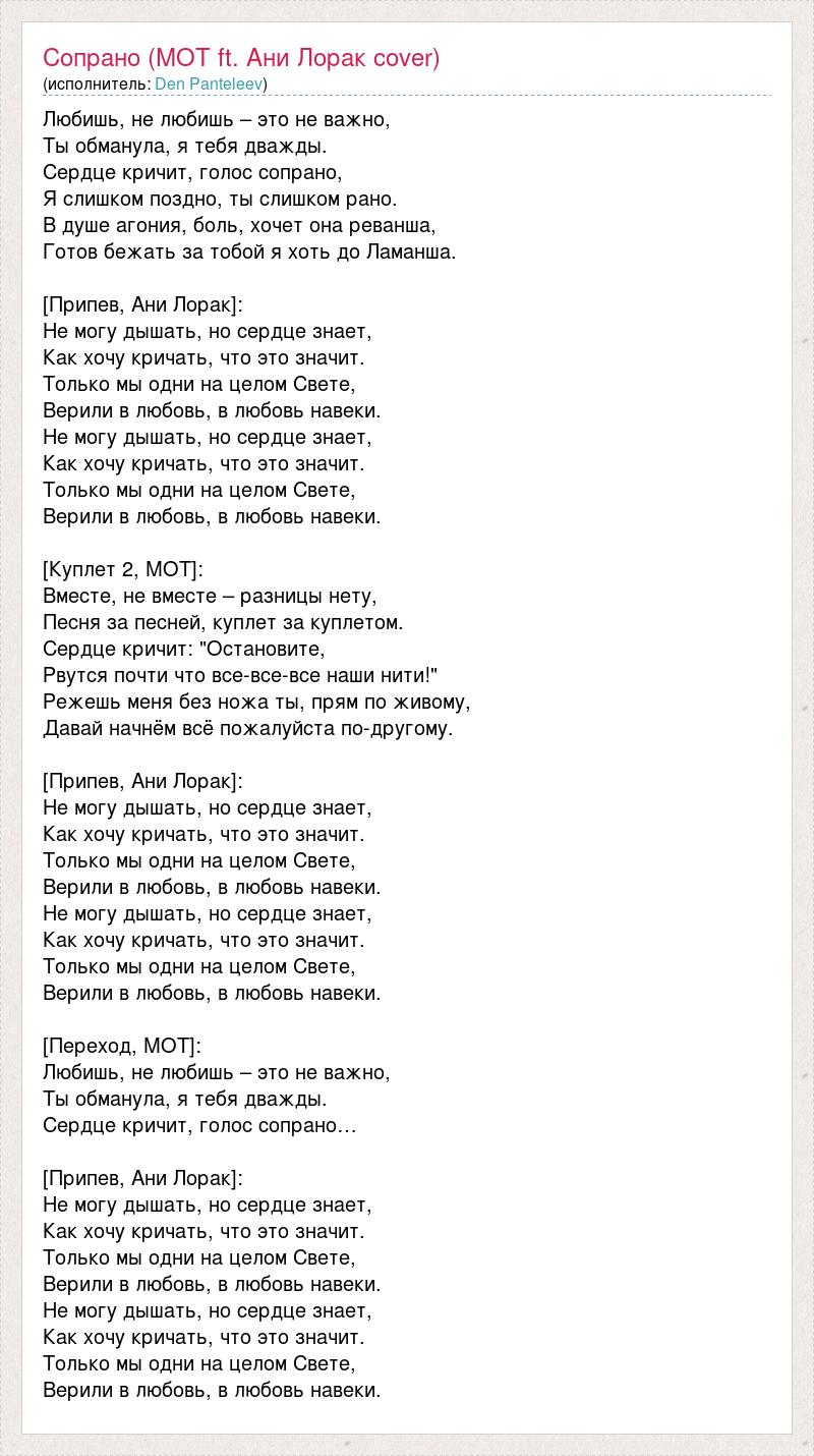 Любишь, не любишь – это не важно, Ты обманула, я тебя дважды. Сердце кричит, голос сопрано, Я слишком поздно, ты слишком рано. В душе агония, боль, хочет она реванша, Готов бежать за тобой я хоть до Ламанша. [Припев, Ани Лорак]: Не могу дышать, но сердце знает, Как хочу кричать, что это значит. Только мы одни на целом Свете, Верили в любовь, в любовь навеки. Не могу дышать, но сердце знает, Как хочу кричать, что это значит. Только мы одни на целом Свете, Верили в любовь, в любовь навеки. [Куплет 2, МОТ]: Вместе, не вместе – разницы нету, Песня за песней, куплет за куплетом. Сердце кричит: "Остановите, Рвутся почти что все-все-все наши нити!" Режешь меня без ножа ты, прям по живому, Давай начнём всё пожалуйста по-другому. [Припев, Ани Лорак]: Не могу дышать, но сердце знает, Как хочу кричать, что это значит. Только мы одни на целом Свете, Верили в любовь, в любовь навеки. Не могу дышать, но сердце знает, Как хочу кричать, что это значит. Только мы одни на целом Свете, Верили в любовь, в любовь навеки. [Переход, МОТ]: Любишь, не любишь – это не важно, Ты обманула, я тебя дважды. Сердце кричит, голос сопрано… [Припев, Ани Лорак]: Не могу дышать, но сердце знает, Как хочу кричать, что это значит. Только мы одни на целом Свете, Верили в любовь, в любовь навеки. Не могу дышать, но сердце знает, Как хочу кричать, что это значит. Только мы одни на целом Свете, Верили в любовь, в любовь навеки.