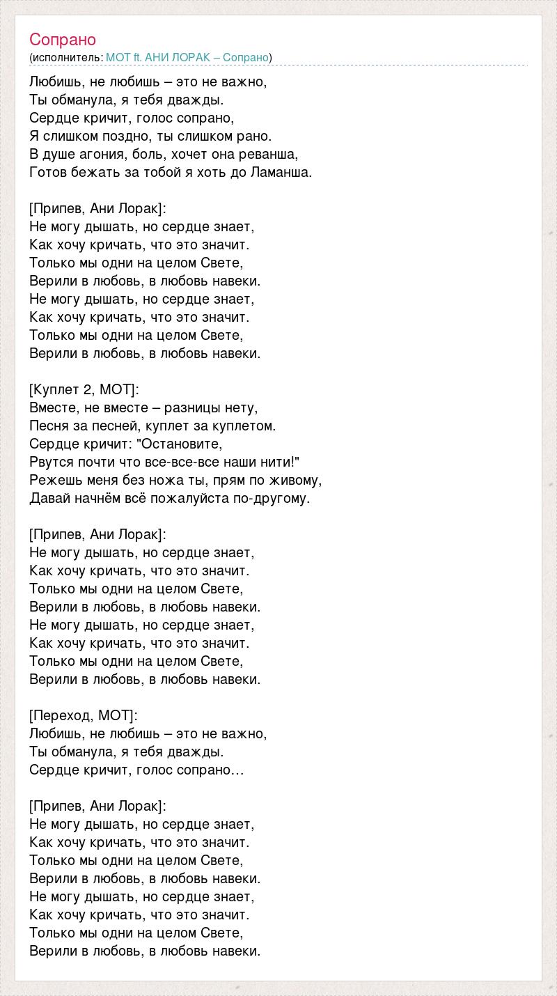 Любишь, не любишь – это не важно, Ты обманула, я тебя дважды. Сердце кричит, голос сопрано, Я слишком поздно, ты слишком рано. В душе агония, боль, хочет она реванша, Готов бежать за тобой я хоть до Ламанша. [Припев, Ани Лорак]: Не могу дышать, но сердце знает, Как хочу кричать, что это значит. Только мы одни на целом Свете, Верили в любовь, в любовь навеки. Не могу дышать, но сердце знает, Как хочу кричать, что это значит. Только мы одни на целом Свете, Верили в любовь, в любовь навеки. [Куплет 2, МОТ]: Вместе, не вместе – разницы нету, Песня за песней, куплет за куплетом. Сердце кричит: "Остановите, Рвутся почти что все-все-все наши нити!" Режешь меня без ножа ты, прям по живому, Давай начнём всё пожалуйста по-другому. [Припев, Ани Лорак]: Не могу дышать, но сердце знает, Как хочу кричать, что это значит. Только мы одни на целом Свете, Верили в любовь, в любовь навеки. Не могу дышать, но сердце знает, Как хочу кричать, что это значит. Только мы одни на целом Свете, Верили в любовь, в любовь навеки. [Переход, МОТ]: Любишь, не любишь – это не важно, Ты обманула, я тебя дважды. Сердце кричит, голос сопрано… [Припев, Ани Лорак]: Не могу дышать, но сердце знает, Как хочу кричать, что это значит. Только мы одни на целом Свете, Верили в любовь, в любовь навеки. Не могу дышать, но сердце знает, Как хочу кричать, что это значит. Только мы одни на целом Свете, Верили в любовь, в любовь навеки.