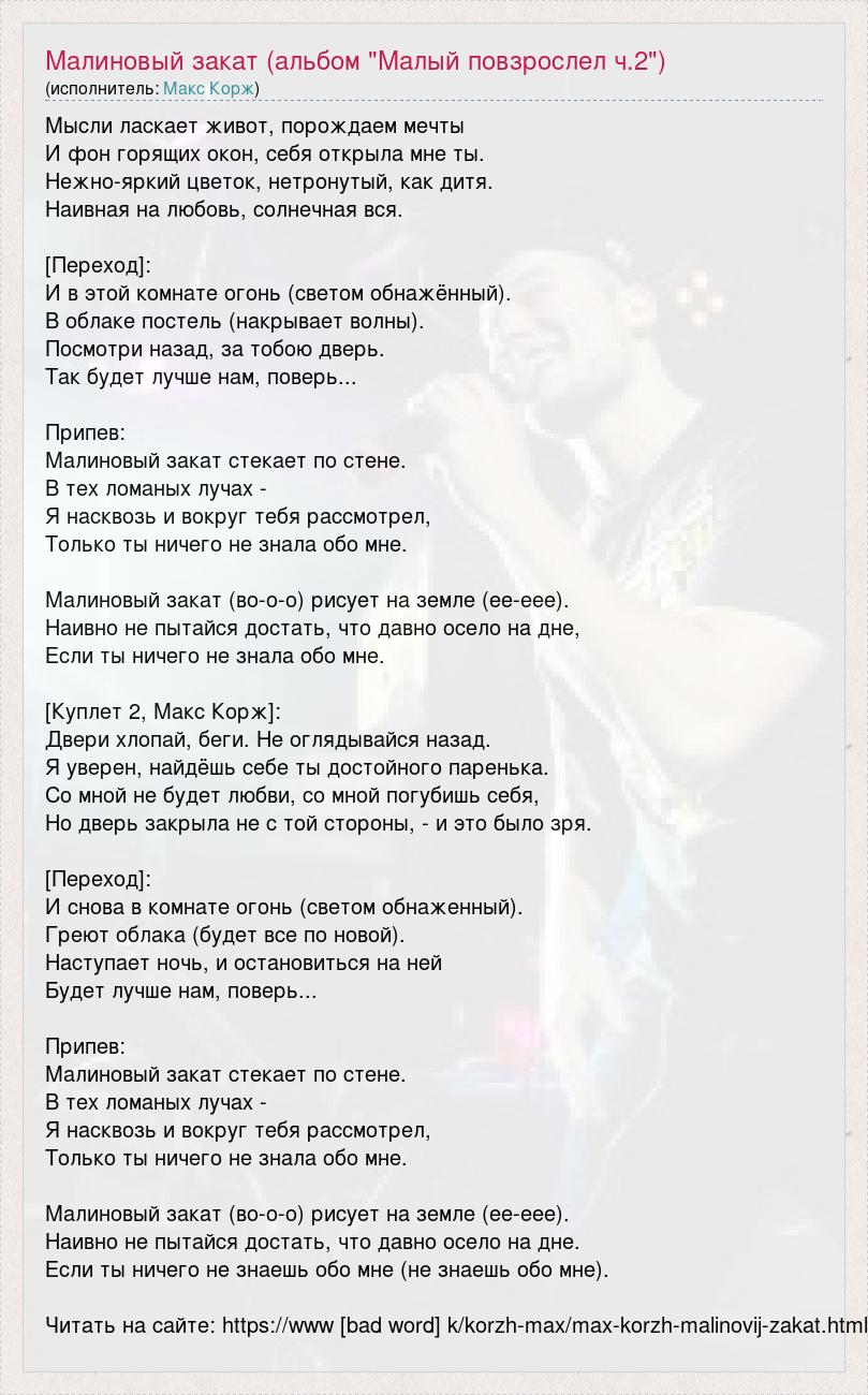 Мысли ласкает живот, порождаем мечты И фон горящих окон, себя открыла мне ты. Нежно-яркий цветок, нетронутый, как дитя. Наивная на любовь, солнечная вся. [Переход]: И в этой комнате огонь (светом обнажённый). В облаке постель (накрывает волны). Посмотри назад, за тобою дверь. Так будет лучше нам, поверь... Припев: Малиновый закат стекает по стене. В тех ломаных лучах - Я насквозь и вокруг тебя рассмотрел, Только ты ничего не знала обо мне. Малиновый закат (во-о-о) рисует на земле (ее-еее). Наивно не пытайся достать, что давно осело на дне, Если ты ничего не знала обо мне. [Куплет 2, Макс Корж]: Двери хлопай, беги. Не оглядывайся назад. Я уверен, найдёшь себе ты достойного паренька. Со мной не будет любви, со мной погубишь себя, Но дверь закрыла не с той стороны, - и это было зря. [Переход]: И снова в комнате огонь (светом обнаженный). Греют облака (будет все по новой). Наступает ночь, и остановиться на ней Будет лучше нам, поверь... Припев: Малиновый закат стекает по стене. В тех ломаных лучах - Я насквозь и вокруг тебя рассмотрел, Только ты ничего не знала обо мне. Малиновый закат (во-о-о) рисует на земле (ее-еее). Наивно не пытайся достать, что давно осело на дне. Если ты ничего не знаешь обо мне (не знаешь обо мне). Читать на сайте: https://www [bad word] k/korzh-max/max-korzh-malinovij-zakat.html