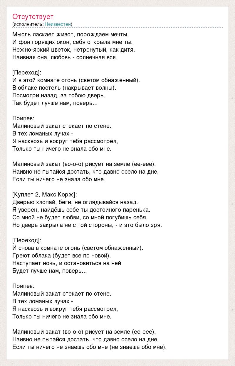 Мысль ласкает живот, порождаем мечты, И фон горящих окон, себя открыла мне ты. Нежно-яркий цветок, нетронутый, как дитя. Наивная она, любовь - солнечная вся. [Переход]: И в этой комнате огонь (светом обнажённый). В облаке постель (накрывает волны). Посмотри назад, за тобою дверь. Так будет лучше нам, поверь... Припев: Малиновый закат стекает по стене. В тех ломаных лучах - Я насквозь и вокруг тебя рассмотрел, Только ты ничего не знала обо мне. Малиновый закат (во-о-о) рисует на земле (ее-еее). Наивно не пытайся достать, что давно осело на дне, Если ты ничего не знала обо мне. [Куплет 2, Макс Корж]: Дверью хлопай, беги, не оглядывайся назад. Я уверен, найдёшь себе ты достойного паренька. Со мной не будет любви, со мной погубишь себя, Но дверь закрыла не с той стороны, - и это было зря. [Переход]: И снова в комнате огонь (светом обнаженный). Греют облака (будет все по новой). Наступает ночь, и остановиться на ней Будет лучше нам, поверь... Припев: Малиновый закат стекает по стене. В тех ломаных лучах - Я насквозь и вокруг тебя рассмотрел, Только ты ничего не знала обо мне. Малиновый закат (во-о-о) рисует на земле (ее-еее). Наивно не пытайся достать, что давно осело на дне. Если ты ничего не знаешь обо мне (не знаешь обо мне).