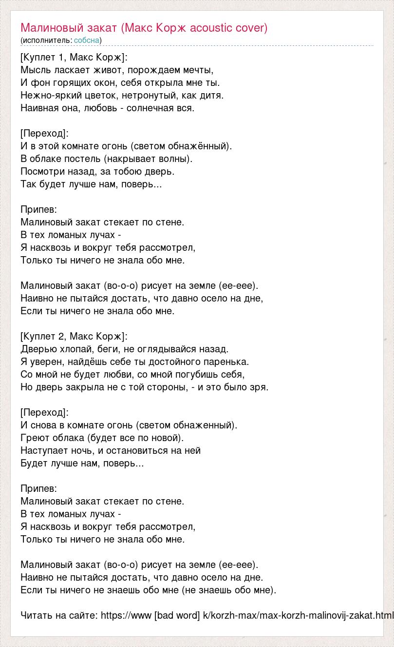 [Куплет 1, Макс Корж]: Мысль ласкает живот, порождаем мечты, И фон горящих окон, себя открыла мне ты. Нежно-яркий цветок, нетронутый, как дитя. Наивная она, любовь - солнечная вся. [Переход]: И в этой комнате огонь (светом обнажённый). В облаке постель (накрывает волны). Посмотри назад, за тобою дверь. Так будет лучше нам, поверь... Припев: Малиновый закат стекает по стене. В тех ломаных лучах - Я насквозь и вокруг тебя рассмотрел, Только ты ничего не знала обо мне. Малиновый закат (во-о-о) рисует на земле (ее-еее). Наивно не пытайся достать, что давно осело на дне, Если ты ничего не знала обо мне. [Куплет 2, Макс Корж]: Дверью хлопай, беги, не оглядывайся назад. Я уверен, найдёшь себе ты достойного паренька. Со мной не будет любви, со мной погубишь себя, Но дверь закрыла не с той стороны, - и это было зря. [Переход]: И снова в комнате огонь (светом обнаженный). Греют облака (будет все по новой). Наступает ночь, и остановиться на ней Будет лучше нам, поверь... Припев: Малиновый закат стекает по стене. В тех ломаных лучах - Я насквозь и вокруг тебя рассмотрел, Только ты ничего не знала обо мне. Малиновый закат (во-о-о) рисует на земле (ее-еее). Наивно не пытайся достать, что давно осело на дне. Если ты ничего не знаешь обо мне (не знаешь обо мне). Читать на сайте: https://www [bad word] k/korzh-max/max-korzh-malinovij-zakat.html