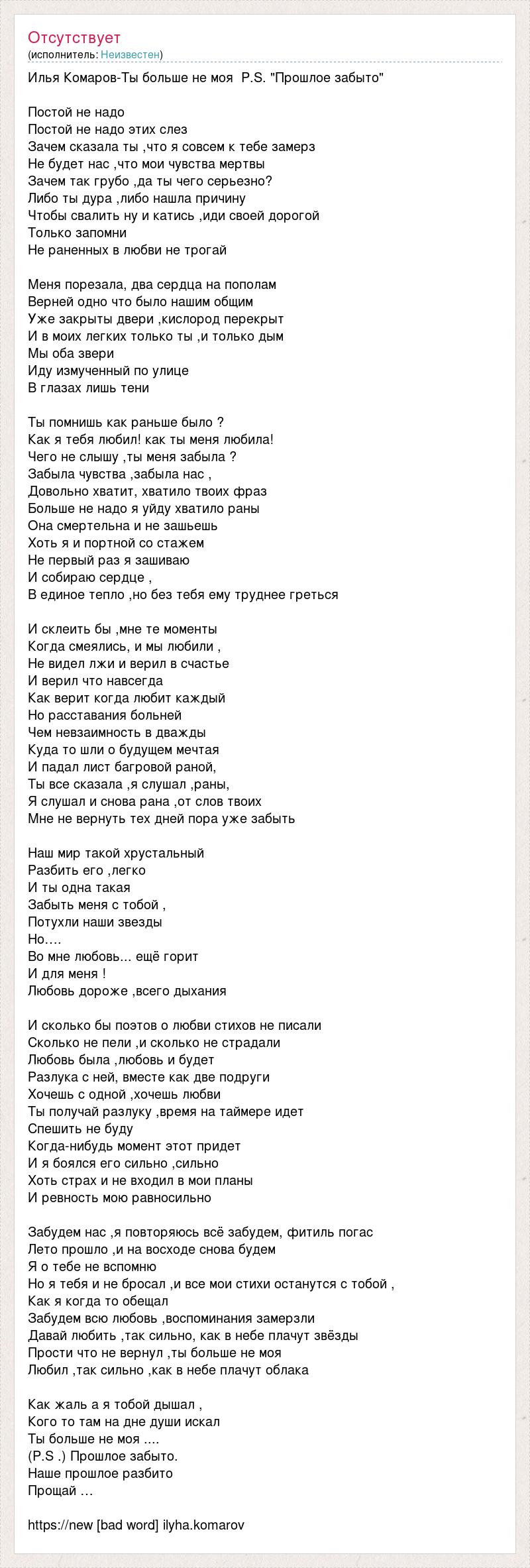 Илья Комаров-Ты больше не моя P.S. "Прошлое забыто" Постой не надо Постой не надо этих слез Зачем сказала ты ,что я совсем к тебе замерз Не будет нас ,что мои чувства мертвы Зачем так грубо ,да ты чего серьезно? Либо ты дура ,либо нашла причину Чтобы свалить ну и катись ,иди своей дорогой Только запомни Не раненных в любви не трогай Меня порезала, два сердца на пополам Верней одно что было нашим общим Уже закрыты двери ,кислород перекрыт И в моих легких только ты ,и только дым Мы оба звери Иду измученный по улице В глазах лишь тени Ты помнишь как раньше было ? Как я тебя любил! как ты меня любила! Чего не слышу ,ты меня забыла ? Забыла чувства ,забыла нас , Довольно хватит, хватило твоих фраз Больше не надо я уйду хватило раны Она смертельна и не зашьешь Хоть я и портной со стажем Не первый раз я зашиваю И собираю сердце , В единое тепло ,но без тебя ему труднее греться И склеить бы ,мне те моменты Когда смеялись, и мы любили , Не видел лжи и верил в счастье И верил что навсегда Как верит когда любит каждый Но расставания больней Чем невзаимность в дважды Куда то шли о будущем мечтая И падал лист багровой раной, Ты все сказала ,я слушал ,раны, Я слушал и снова рана ,от слов твоих Мне не вернуть тех дней пора уже забыть Наш мир такой хрустальный Разбить его ,легко И ты одна такая Забыть меня с тобой , Потухли наши звезды Но…. Во мне любовь... ещё горит И для меня ! Любовь дороже ,всего дыхания И сколько бы поэтов о любви стихов не писали Сколько не пели ,и сколько не страдали Любовь была ,любовь и будет Разлука с ней, вместе как две подруги Хочешь с одной ,хочешь любви Ты получай разлуку ,время на таймере идет Спешить не буду Когда-нибудь момент этот придет И я боялся его сильно ,сильно Хоть страх и не входил в мои планы И ревность мою равносильно Забудем нас ,я повторяюсь всё забудем, фитиль погас Лето прошло ,и на восходе снова будем Я о тебе не вспомню Но я тебя и не бросал ,и все мои стихи останутся с тобой , Как я когда то обещал Забудем всю любовь ,воспоминания замерзли Давай любить ,так сильно, как в небе плачут звёзды Прости что не вернул ,ты больше не моя Любил ,так сильно ,как в небе плачут облака Как жаль а я тобой дышал , Кого то там на дне души искал Ты больше не моя .... (P.S .) Прошлое забыто. Наше прошлое разбито Прощай … https://new [bad word] ilyha.komarov