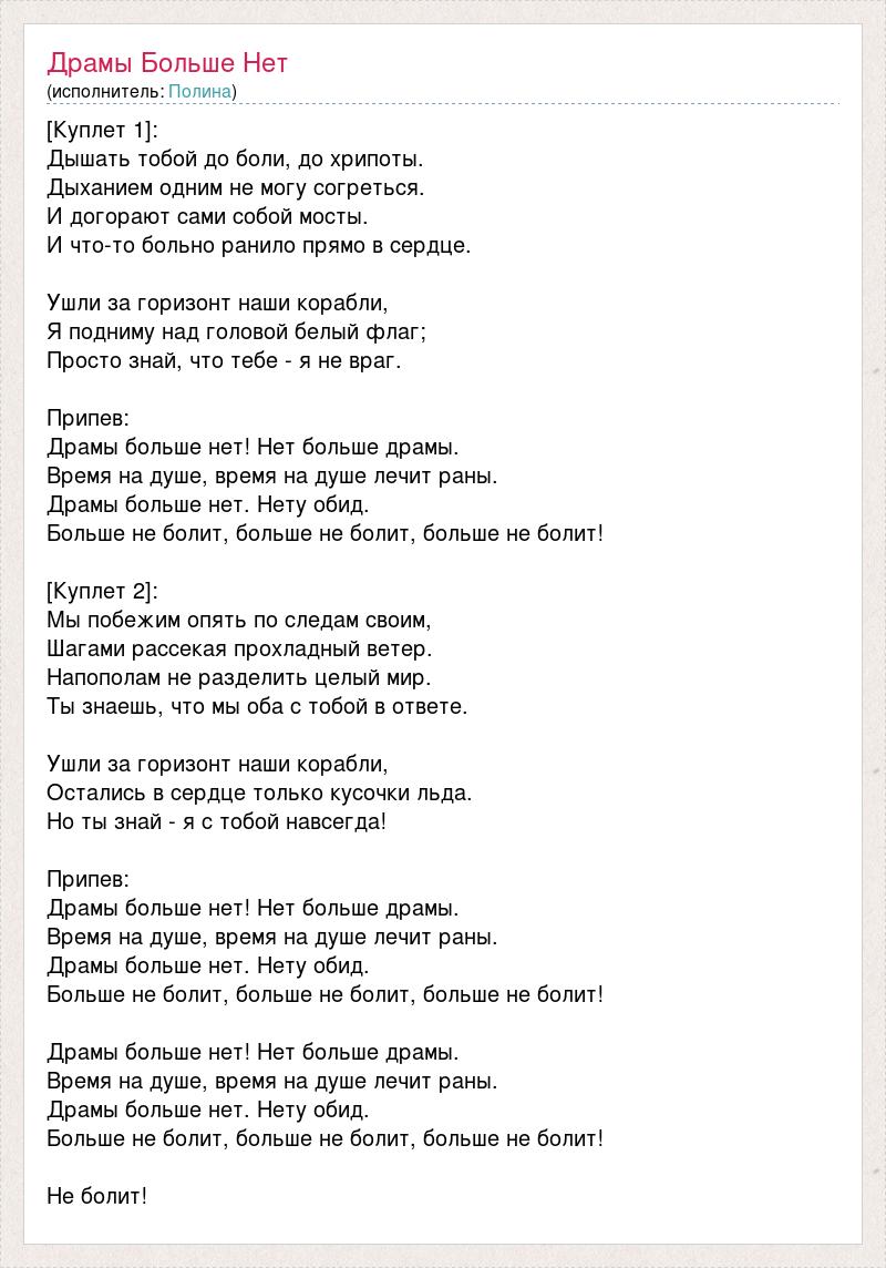 [Куплет 1]: Дышать тобой до боли, до хрипоты. Дыханием одним не могу согреться. И догорают сами собой мосты. И что-то больно ранило прямо в сердце. Ушли за горизонт наши корабли, Я подниму над головой белый флаг; Просто знай, что тебе - я не враг. Припев: Драмы больше нет! Нет больше драмы. Время на душе, время на душе лечит раны. Драмы больше нет. Нету обид. Больше не болит, больше не болит, больше не болит! [Куплет 2]: Мы побежим опять по следам своим, Шагами рассекая прохладный ветер. Напополам не разделить целый мир. Ты знаешь, что мы оба с тобой в ответе. Ушли за горизонт наши корабли, Остались в сердце только кусочки льда. Но ты знай - я с тобой навсегда! Припев: Драмы больше нет! Нет больше драмы. Время на душе, время на душе лечит раны. Драмы больше нет. Нету обид. Больше не болит, больше не болит, больше не болит! Драмы больше нет! Нет больше драмы. Время на душе, время на душе лечит раны. Драмы больше нет. Нету обид. Больше не болит, больше не болит, больше не болит! Не болит!