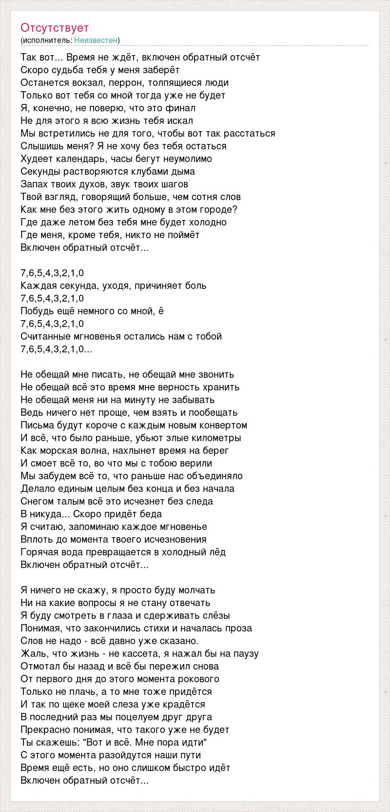 Так вот... Время не ждёт, включен обратный отсчёт Скоро судьба тебя у меня заберёт Останется вокзал, перрон, толпящиеся люди Только вот тебя со мной тогда уже не будет Я, конечно, не поверю, что это финал Не для этого я всю жизнь тебя искал Мы встретились не для того, чтобы вот так расстаться Слышишь меня? Я не хочу без тебя остаться Худеет календарь, часы бегут неумолимо Секунды растворяются клубами дыма Запах твоих духов, звук твоих шагов Твой взгляд, говорящий больше, чем сотня слов Как мне без этого жить одному в этом городе? Где даже летом без тебя мне будет холодно Где меня, кроме тебя, никто не поймёт Включен обратный отсчёт... 7,6,5,4,3,2,1,0 Каждая секунда, уходя, причиняет боль 7,6,5,4,3,2,1,0 Побудь ещё немного со мной, ё 7,6,5,4,3,2,1,0 Считанные мгновенья остались нам с тобой 7,6,5,4,3,2,1,0... Не обещай мне писать, не обещай мне звонить Не обещай всё это время мне верность хранить Не обещай меня ни на минуту не забывать Ведь ничего нет проще, чем взять и пообещать Письма будут короче с каждым новым конвертом И всё, что было раньше, убьют злые километры Как морская волна, нахлынет время на берег И смоет всё то, во что мы с тобою верили Мы забудем всё то, что раньше нас объединяло Делало единым целым без конца и без начала Снегом талым всё это исчезнет без следа В никуда... Скоро придёт беда Я считаю, запоминаю каждое мгновенье Вплоть до момента твоего исчезновения Горячая вода превращается в холодный лёд Включен обратный отсчёт... Я ничего не скажу, я просто буду молчать Ни на какие вопросы я не стану отвечать Я буду смотреть в глаза и сдерживать слёзы Понимая, что закончились стихи и началась проза Слов не надо - всё давно уже сказано. Жаль, что жизнь - не кассета, я нажал бы на паузу Отмотал бы назад и всё бы пережил снова От первого дня до этого момента рокового Только не плачь, а то мне тоже придётся И так по щеке моей слеза уже крадётся В последний раз мы поцелуем друг друга Прекрасно понимая, что такого уже не будет Ты скажешь: "Вот и всё. Мне пора идти" С этого момента разойдутся наши пути Время ещё есть, но оно слишком быстро идёт Включен обратный отсчёт...