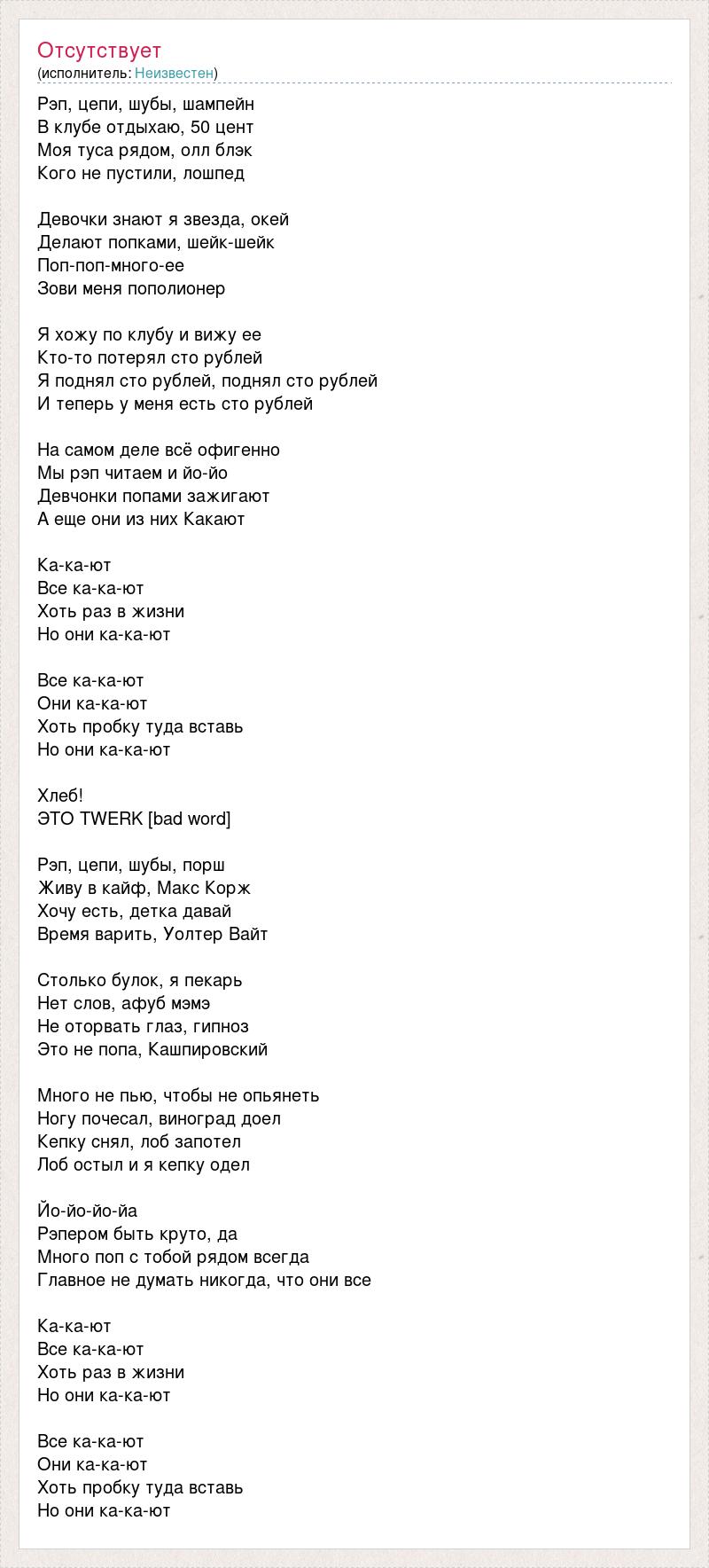 Рэп, цепи, шубы, шампейн В клубе отдыхаю, 50 цент Моя туса рядом, олл блэк Кого не пустили, лошпед Девочки знают я звезда, окей Делают попками, шейк-шейк Поп-поп-много-ее Зови меня пополионер Я хожу по клубу и вижу ее Кто-то потерял сто рублей Я поднял сто рублей, поднял сто рублей И теперь у меня есть сто рублей На самом деле всё офигенно Мы рэп читаем и йо-йо Девчонки попами зажигают А еще они из них Какают Ка-ка-ют Все ка-ка-ют Хоть раз в жизни Но они ка-ка-ют Все ка-ка-ют Они ка-ка-ют Хоть пробку туда вставь Но они ка-ка-ют Хлеб! ЭТО TWERK [bad word] Рэп, цепи, шубы, порш Живу в кайф, Макс Корж Хочу есть, детка давай Время варить, Уолтер Вайт Столько булок, я пекарь Нет слов, афуб мэмэ Не оторвать глаз, гипноз Это не попа, Кашпировский Много не пью, чтобы не опьянеть Ногу почесал, виноград доел Кепку снял, лоб запотел Лоб остыл и я кепку одел Йо-йо-йо-йа Рэпером быть круто, да Много поп с тобой рядом всегда Главное не думать никогда, что они все Ка-ка-ют Все ка-ка-ют Хоть раз в жизни Но они ка-ка-ют Все ка-ка-ют Они ка-ка-ют Хоть пробку туда вставь Но они ка-ка-ют