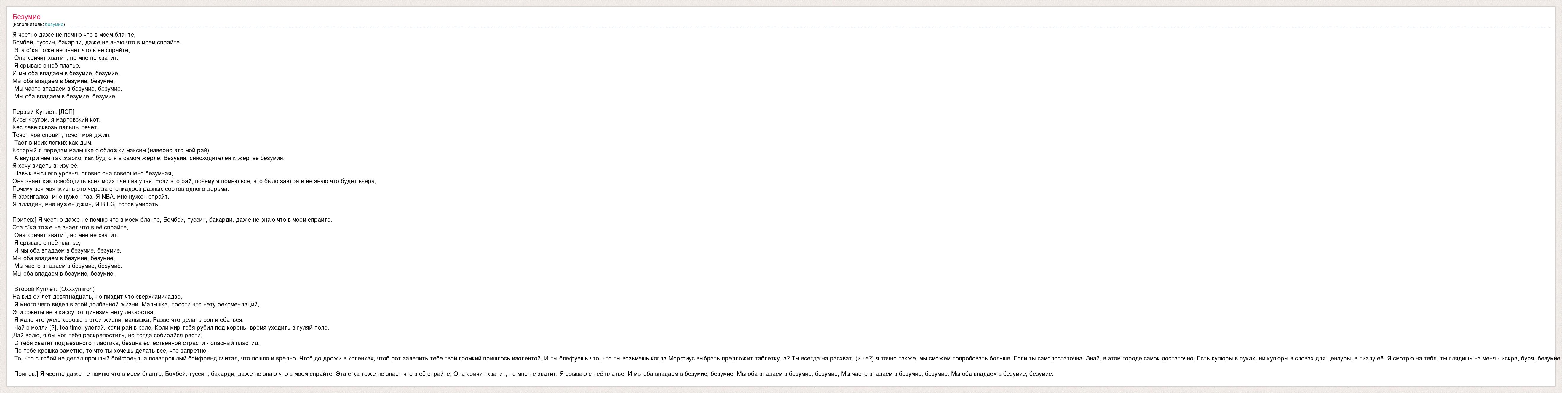 Я честно даже не помню что в моем бланте, Бомбей, туссин, бакарди, даже не знаю что в моем спрайте. Эта с*ка тоже не знает что в её спрайте, Она кричит хватит, но мне не хватит. Я срываю с неё платье, И мы оба впадаем в безумие, безумие. Мы оба впадаем в безумие, безумие, Мы часто впадаем в безумие, безумие. Мы оба впадаем в безумие, безумие. Первый Куплет: [ЛСП] Кисы кругом, я мартовский кот, Кес лаве сквозь пальцы течет. Течет мой спрайт, течет мой джин, Тает в моих легких как дым. Который я передам малышке с обложки максим (наверно это мой рай) А внутри неё так жарко, как будто я в самом жерле. Везувия, снисходителен к жертве безумия, Я хочу видеть внизу её. Навык высшего уровня, словно она совершено безумная, Она знает как освободить всех моих пчел из улья. Если это рай, почему я помню все, что было завтра и не знаю что будет вчера, Почему вся моя жизнь это череда стопкадров разных сортов одного дерьма. Я зажигалка, мне нужен газ, Я NBA, мне нужен спрайт. Я алладин, мне нужен джин, Я B.I.G, готов умирать. Припев:] Я честно даже не помню что в моем бланте, Бомбей, туссин, бакарди, даже не знаю что в моем спрайте. Эта с*ка тоже не знает что в её спрайте, Она кричит хватит, но мне не хватит. Я срываю с неё платье, И мы оба впадаем в безумие, безумие. Мы оба впадаем в безумие, безумие, Мы часто впадаем в безумие, безумие. Мы оба впадаем в безумие, безумие. Второй Куплет: (Oxxxymiron) На вид ей лет девятнадцать, но пиздит что сверхкамикадзе, Я много чего видел в этой долбанной жизни. Малышка, прости что нету рекомендаций, Эти советы не в кассу, от цинизма нету лекарства. Я мало что умею хорошо в этой жизни, малышка, Разве что делать рэп и ебаться. Чай с молли [?], tea time, улетай, коли рай в коле, Коли мир тебя рубил под корень, время уходить в гуляй-поле. Дай волю, я бы мог тебя раскрепостить, но тогда собирайся расти, С тебя хватит подъездного пластика, бездна естественной страсти - опасный пластид. По тебе крошка заметно, то что ты хочешь делать все, что запретно, То, что с тобой не делал прошлый бойфренд, а позапрошлый бойфренд считал, что пошло и вредно. Чтоб до дрожи в коленках, чтоб рот залепить тебе твой громкий пришлось изолентой, И ты блефуешь что, что ты возьмешь когда Морфиус выбрать предложит таблетку, а? Ты всегда на расхват, (и че?) я точно также, мы сможем попробовать больше. Если ты самодостаточна. Знай, в этом городе самок достаточно, Есть купюры в руках, ни купюры в словах для цензуры, в пизду её. Я смотрю на тебя, ты глядишь на меня - искра, буря, безумие. Припев:] Я честно даже не помню что в моем бланте, Бомбей, туссин, бакарди, даже не знаю что в моем спрайте. Эта с*ка тоже не знает что в её спрайте, Она кричит хватит, но мне не хватит. Я срываю с неё платье, И мы оба впадаем в безумие, безумие. Мы оба впадаем в безумие, безумие, Мы часто впадаем в безумие, безумие. Мы оба впадаем в безумие, безумие.