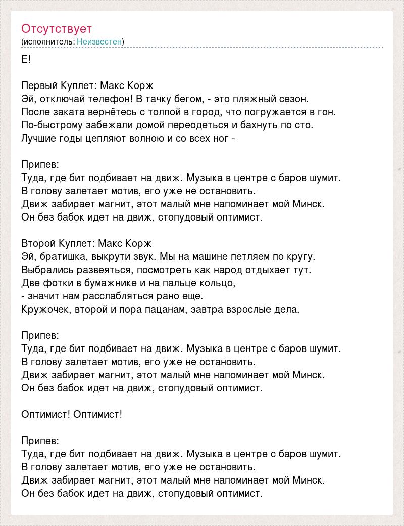 Е! Первый Куплет: Макс Корж Эй, отключай телефон! В тачку бегом, - это пляжный сезон. После заката вернётесь с толпой в город, что погружается в гон. По-быстрому забежали домой переодеться и бахнуть по сто. Лучшие годы цепляют волною и со всех ног - Припев: Туда, где бит подбивает на движ. Музыка в центре с баров шумит. В голову залетает мотив, его уже не остановить. Движ забирает магнит, этот малый мне напоминает мой Минск. Он без бабок идет на движ, стопудовый оптимист. Второй Куплет: Макс Корж Эй, братишка, выкрути звук. Мы на машине петляем по кругу. Выбрались развеяться, посмотреть как народ отдыхает тут. Две фотки в бумажнике и на пальце кольцо, - значит нам расслабляться рано еще. Кружочек, второй и пора пацанам, завтра взрослые дела. Припев: Туда, где бит подбивает на движ. Музыка в центре с баров шумит. В голову залетает мотив, его уже не остановить. Движ забирает магнит, этот малый мне напоминает мой Минск. Он без бабок идет на движ, стопудовый оптимист. Оптимист! Оптимист! Припев: Туда, где бит подбивает на движ. Музыка в центре с баров шумит. В голову залетает мотив, его уже не остановить. Движ забирает магнит, этот малый мне напоминает мой Минск. Он без бабок идет на движ, стопудовый оптимист.