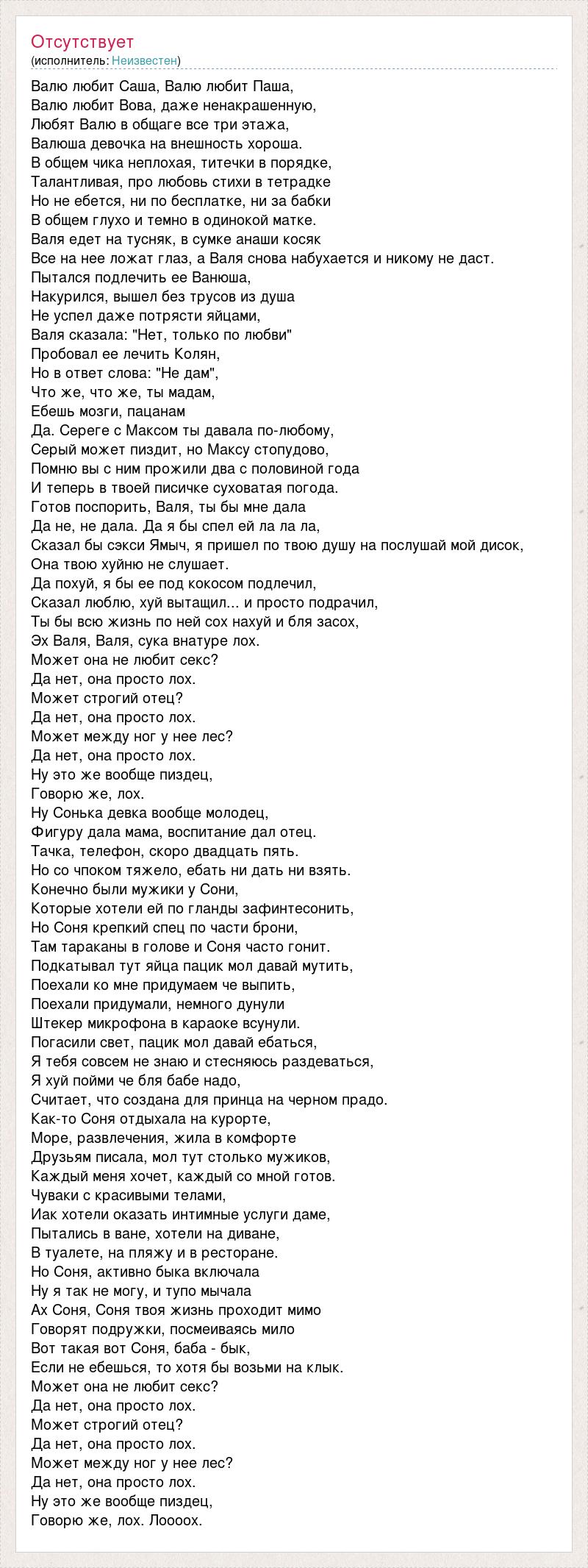 Валю любит Саша, Валю любит Паша, Валю любит Вова, даже ненакрашенную, Любят Валю в общаге все три этажа, Валюша девочка на внешность хороша. В общем чика неплохая, титечки в порядке, Талантливая, про любовь стихи в тетрадке Но не ебется, ни по бесплатке, ни за бабки В общем глухо и темно в одинокой матке. Валя едет на тусняк, в сумке анаши косяк Все на нее ложат глаз, а Валя снова набухается и никому не даст. Пытался подлечить ее Ванюша, Накурился, вышел без трусов из душа Не успел даже потрясти яйцами, Валя сказала: "Нет, только по любви" Пробовал ее лечить Колян, Но в ответ слова: "Не дам", Что же, что же, ты мадам, Ебешь мозги, пацанам Да. Сереге с Максом ты давала по-любому, Серый может пиздит, но Максу стопудово, Помню вы с ним прожили два с половиной года И теперь в твоей писичке суховатая погода. Готов поспорить, Валя, ты бы мне дала Да не, не дала. Да я бы спел ей ла ла ла, Сказал бы сэкси Ямыч, я пришел по твою душу на послушай мой дисок, Она твою хуйню не слушает. Да похуй, я бы ее под кокосом подлечил, Сказал люблю, хуй вытащил... и просто подрачил, Ты бы всю жизнь по ней сох нахуй и бля засох, Эх Валя, Валя, сука внатуре лох. Может она не любит секс? Да нет, она просто лох. Может строгий отец? Да нет, она просто лох. Может между ног у нее лес? Да нет, она просто лох. Ну это же вообще пиздец, Говорю же, лох. Ну Сонька девка вообще молодец, Фигуру дала мама, воспитание дал отец. Тачка, телефон, скоро двадцать пять. Но со чпоком тяжело, ебать ни дать ни взять. Конечно были мужики у Сони, Которые хотели ей по гланды зафинтесонить, Но Соня крепкий спец по части брони, Там тараканы в голове и Соня часто гонит. Подкатывал тут яйца пацик мол давай мутить, Поехали ко мне придумаем че выпить, Поехали придумали, немного дунули Штекер микрофона в караоке всунули. Погасили свет, пацик мол давай ебаться, Я тебя совсем не знаю и стесняюсь раздеваться, Я хуй пойми че бля бабе надо, Считает, что создана для принца на черном прадо. Как-то Соня отдыхала на курорте, Море, развлечения, жила в комфорте Друзьям писала, мол тут столько мужиков, Каждый меня хочет, каждый со мной готов. Чуваки с красивыми телами, Иак хотели оказать интимные услуги даме, Пытались в ване, хотели на диване, В туалете, на пляжу и в ресторане. Но Соня, активно быка включала Ну я так не могу, и тупо мычала Ах Соня, Соня твоя жизнь проходит мимо Говорят подружки, посмеиваясь мило Вот такая вот Соня, баба - бык, Если не ебешься, то хотя бы возьми на клык. Может она не любит секс? Да нет, она просто лох. Может строгий отец? Да нет, она просто лох. Может между ног у нее лес? Да нет, она просто лох. Ну это же вообще пиздец, Говорю же, лох. Лоооох.