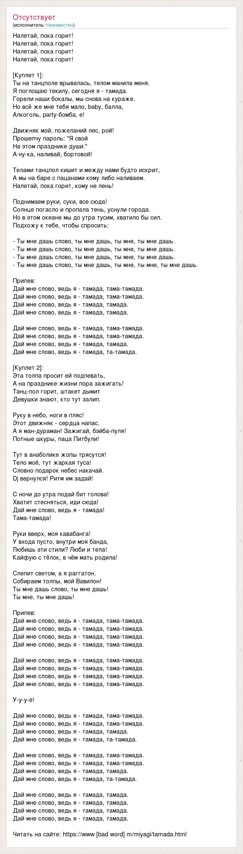 Налетай, пока горит! Налетай, пока горит! Налетай, пока горит! Налетай, пока горит! [Куплет 1]: Ты на танцполе врывалась, телом манила меня. Я поглощаю текилу, сегодня я - тамада. Горели наши бокалы, мы снова на кураже. Но всё же мне тебя мало, baby, балла, Алкоголь, party-бомба, е! Движняк мой, пожеланий лес, рой! Прошепчу пароль: "Я свой На этом празднике души." А ну-ка, наливай, бортовой! Телами танцпол кишит и между нами будто искрит, А мы на баре с пацанами кому либо наливаем. Налетай, пока горит, кому не лень! Поднимаем руки, суки, все сюда! Солнце погасло и пропала тень, уснули города. Но в этом океане мы до утра тусим, хватило бы сил. Подхожу к тебе, чтобы спросить: - Ты мне дашь слово, ты мне дашь, ты мне, ты мне дашь. - Ты мне дашь слово, ты мне дашь, ты мне, ты мне дашь. - Ты мне дашь слово, ты мне дашь, ты мне, ты мне дашь. - Ты мне дашь слово, ты мне дашь, ты мне, ты мне, ты мне дашь. Припев: Дай мне слово, ведь я - тамада, тама-тамада. Дай мне слово, ведь я - тамада, тама-тамада. Дай мне слово, ведь я - тамада, тамада. Дай мне слово, ведь я - тамада, тамада. Дай мне слово, ведь я - тамада, тама-тамада. Дай мне слово, ведь я - тамада, тама-тамада. Дай мне слово, ведь я - тамада, тамада. Дай мне слово, ведь я - тамада, та-тамада. [Куплет 2]: Эта толпа просит ей подпевать, А на празднике жизни пора зажигать! Танц-пол горит, штакет дымит Девушки знают, кто тут залип. Руку в небо, ноги в пляс! Этот движняк - сердца напас. А я ман-дураман! Зажигай, бэйба-пуля! Потные шкуры, паца Питбули! Тут в анаболике жопы трясутся! Тело моё, тут жаркая туса! Словно подарок небес накачай. Dj вернулся! Ритм им задай! С ночи до утра подай бит голова! Хватит стесняться, иди сюда! Дай мне слово, ведь я - тамада! Тама-тамада! Руки вверх, моя кавабанга! У входа пусто, внутри моя банда, Любишь эти стили? Люби и тела! Кайфую с тёлок, в чём мать родила! Слепит светом, а я раггатон. Собираем толпы, мой Вавилон! Ты мне дашь слово, ты мне дашь! Ты мне, ты мне дашь! Припев: Дай мне слово, ведь я - тамада, тама-тамада. Дай мне слово, ведь я - тамада, тама-тамада. Дай мне слово, ведь я - тамада, тама-тамада. Дай мне слово, ведь я - тамада, тама-тамада. Дай мне слово, ведь я - тамада, тама-тамада. Дай мне слово, ведь я - тамада, тама-тамада. Дай мне слово, ведь я - тамада, тама-тамада. Дай мне слово, ведь я - тамада, тама-тамада. У-у-у-е! Дай мне слово, ведь я - тамада, тама-тамада. Дай мне слово, ведь я - тамада, тама-тамада. Дай мне слово, ведь я - тамада, тамада. Дай мне слово, ведь я - тамада, та-тамада. Дай мне слово, ведь я - тамада, тама-тамада. Дай мне слово, ведь я - тамада, тама-тамада. Дай мне слово, ведь я - тамада, тамада. Дай мне слово, ведь я - тамада, та-тамада. Дай мне слово, ведь я - тамада, тамада. Дай мне слово, ведь я - тамада, тамада. Дай мне слово, ведь я - тамада, тамада. Дай мне слово, ведь я - тамада, тамада. Читать на сайте: https://www [bad word] m/miyagi/tamada.html