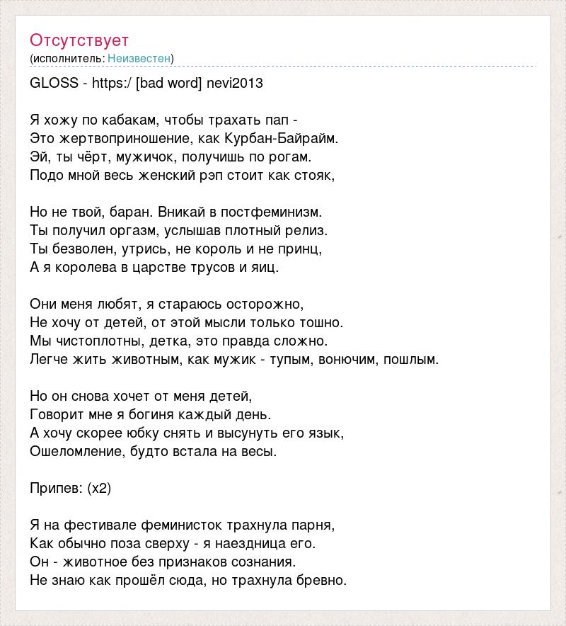 GLOSS - https:/ [bad word] nevi2013 Я хожу по кабакам, чтобы трахать пап - Это жертвоприношение, как Курбан-Байрайм. Эй, ты чёрт, мужичок, получишь по рогам. Подо мной весь женский рэп стоит как стояк, Но не твой, баран. Вникай в постфеминизм. Ты получил оргазм, услышав плотный релиз. Ты безволен, утрись, не король и не принц, А я королева в царстве трусов и яиц. Они меня любят, я стараюсь осторожно, Не хочу от детей, от этой мысли только тошно. Мы чистоплотны, детка, это правда сложно. Легче жить животным, как мужик - тупым, вонючим, пошлым. Но он снова хочет от меня детей, Говорит мне я богиня каждый день. А хочу скорее юбку снять и высунуть его язык, Ошеломление, будто встала на весы. Припев: (х2) Я на фестивале феминисток трахнула парня, Как обычно поза сверху - я наездница его. Он - животное без признаков сознания. Не знаю как прошёл сюда, но трахнула бревно.