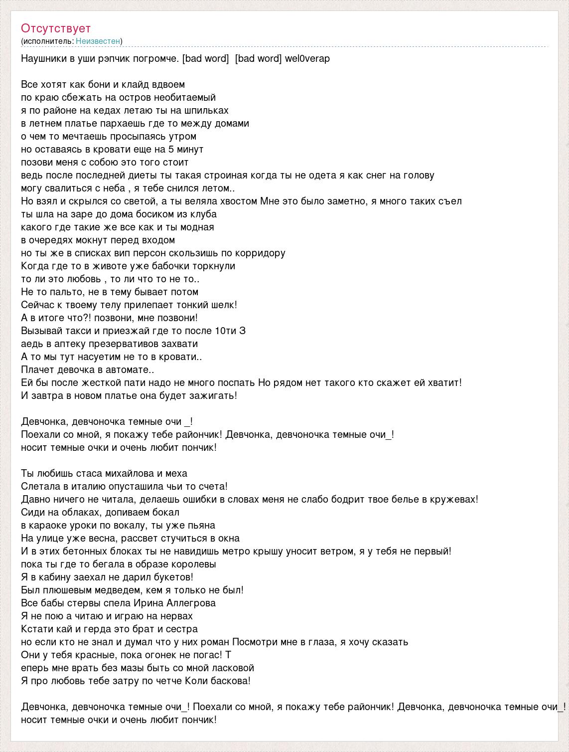 Наушники в уши рэпчик погромче. [bad word] [bad word] wel0verap Все хотят как бони и клайд вдвоем по краю сбежать на остров необитаемый я по районе на кедах летаю ты на шпильках в летнем платье пархаешь где то между домами о чем то мечтаешь просыпаясь утром но оставаясь в кровати еще на 5 минут позови меня с собою это того стоит ведь после последней диеты ты такая строиная когда ты не одета я как снег на голову могу свалиться с неба , я тебе снился летом.. Но взял и скрылся со светой, а ты веляла хвостом Мне это было заметно, я много таких съел ты шла на заре до дома босиком из клуба какого где такие же все как и ты модная в очередях мокнут перед входом но ты же в списках вип персон скользишь по корридору Когда где то в животе уже бабочки торкнули то ли это любовь , то ли что то не то.. Не то пальто, не в тему бывает потом Сейчас к твоему телу прилепает тонкий шелк! А в итоге что?! позвони, мне позвони! Вызывай такси и приезжай где то после 10ти З аедь в аптеку презервативов захвати А то мы тут насуетим не то в кровати.. Плачет девочка в автомате.. Ей бы после жесткой пати надо не много поспать Но рядом нет такого кто скажет ей хватит! И завтра в новом платье она будет зажигать! Девчонка, девчоночка темные очи _! Поехали со мной, я покажу тебе райончик! Девчонка, девчоночка темные очи_! носит темные очки и очень любит пончик! Ты любишь стаса михайлова и меха Слетала в италию опусташила чьи то счета! Давно ничего не читала, делаешь ошибки в словах меня не слабо бодрит твое белье в кружевах! Сиди на облаках, допиваем бокал в караоке уроки по вокалу, ты уже пьяна На улице уже весна, рассвет стучиться в окна И в этих бетонных блоках ты не навидишь метро крышу уносит ветром, я у тебя не первый! пока ты где то бегала в образе королевы Я в кабину заехал не дарил букетов! Был плюшевым медведем, кем я только не был! Все бабы стервы спела Ирина Аллегрова Я не пою а читаю и играю на нервах Кстати кай и герда это брат и сестра но если кто не знал и думал что у них роман Посмотри мне в глаза, я хочу сказать Они у тебя красные, пока огонек не погас! Т еперь мне врать без мазы быть со мной ласковой Я про любовь тебе затру по четче Коли баскова! Девчонка, девчоночка темные очи_! Поехали со мной, я покажу тебе райончик! Девчонка, девчоночка темные очи_! носит темные очки и очень любит пончик!