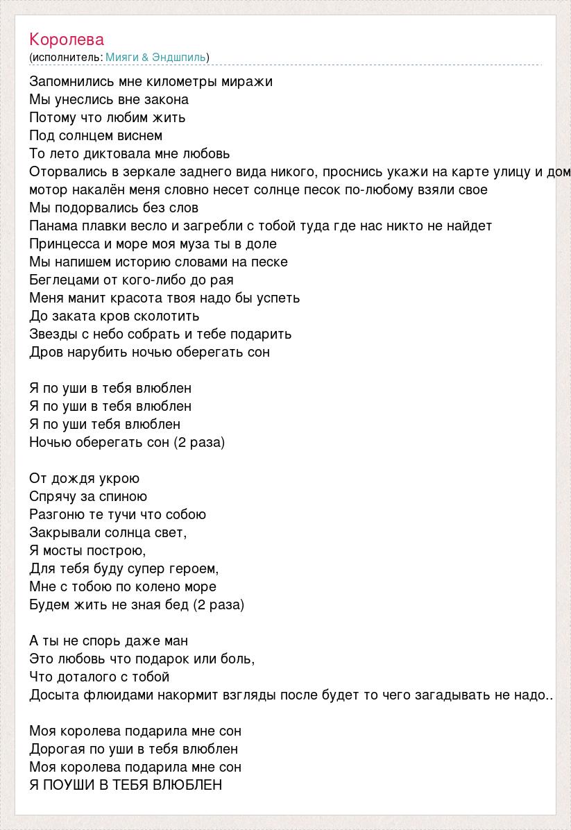 Запомнились мне километры миражи Мы унеслись вне закона Потому что любим жить Под солнцем виснем То лето диктовала мне любовь Оторвались в зеркале заднего вида никого, проснись укажи на карте улицу и дом мотор накалён меня словно несет солнце песок по-любому взяли свое Мы подорвались без слов Панама плавки весло и загребли с тобой туда где нас никто не найдет Принцесса и море моя муза ты в доле Мы напишем историю словами на песке Беглецами от кого-либо до рая Меня манит красота твоя надо бы успеть До заката кров сколотить Звезды с небо собрать и тебе подарить Дров нарубить ночью оберегать сон Я по уши в тебя влюблен Я по уши в тебя влюблен Я по уши тебя влюблен Ночью оберегать сон (2 раза) От дождя укрою Спрячу за спиною Разгоню те тучи что собою Закрывали солнца свет, Я мосты построю, Для тебя буду супер героем, Мне с тобою по колено море Будем жить не зная бед (2 раза) А ты не спорь даже ман Это любовь что подарок или боль, Что доталого с тобой Досыта флюидами накормит взгляды после будет то чего загадывать не надо.. Моя королева подарила мне сон Дорогая по уши в тебя влюблен Моя королева подарила мне сон Я ПОУШИ В ТЕБЯ ВЛЮБЛЕН