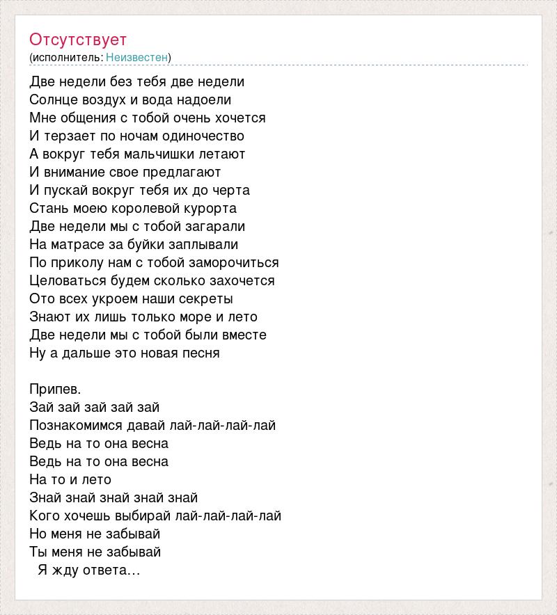 Две недели без тебя две недели Солнце воздух и вода надоели Мне общения с тобой очень хочется И терзает по ночам одиночество А вокруг тебя мальчишки летают И внимание свое предлагают И пускай вокруг тебя их до черта Стань моею королевой курорта Две недели мы с тобой загарали На матрасе за буйки заплывали По приколу нам с тобой заморочиться Целоваться будем сколько захочется Ото всех укроем наши секреты Знают их лишь только море и лето Две недели мы с тобой были вместе Ну а дальше это новая песня Припев. Зай зай зай зай зай Познакомимся давай лай-лай-лай-лай Ведь на то она весна Ведь на то она весна На то и лето Знай знай знай знай знай Кого хочешь выбирай лай-лай-лай-лай Но меня не забывай Ты меня не забывай Я жду ответа…