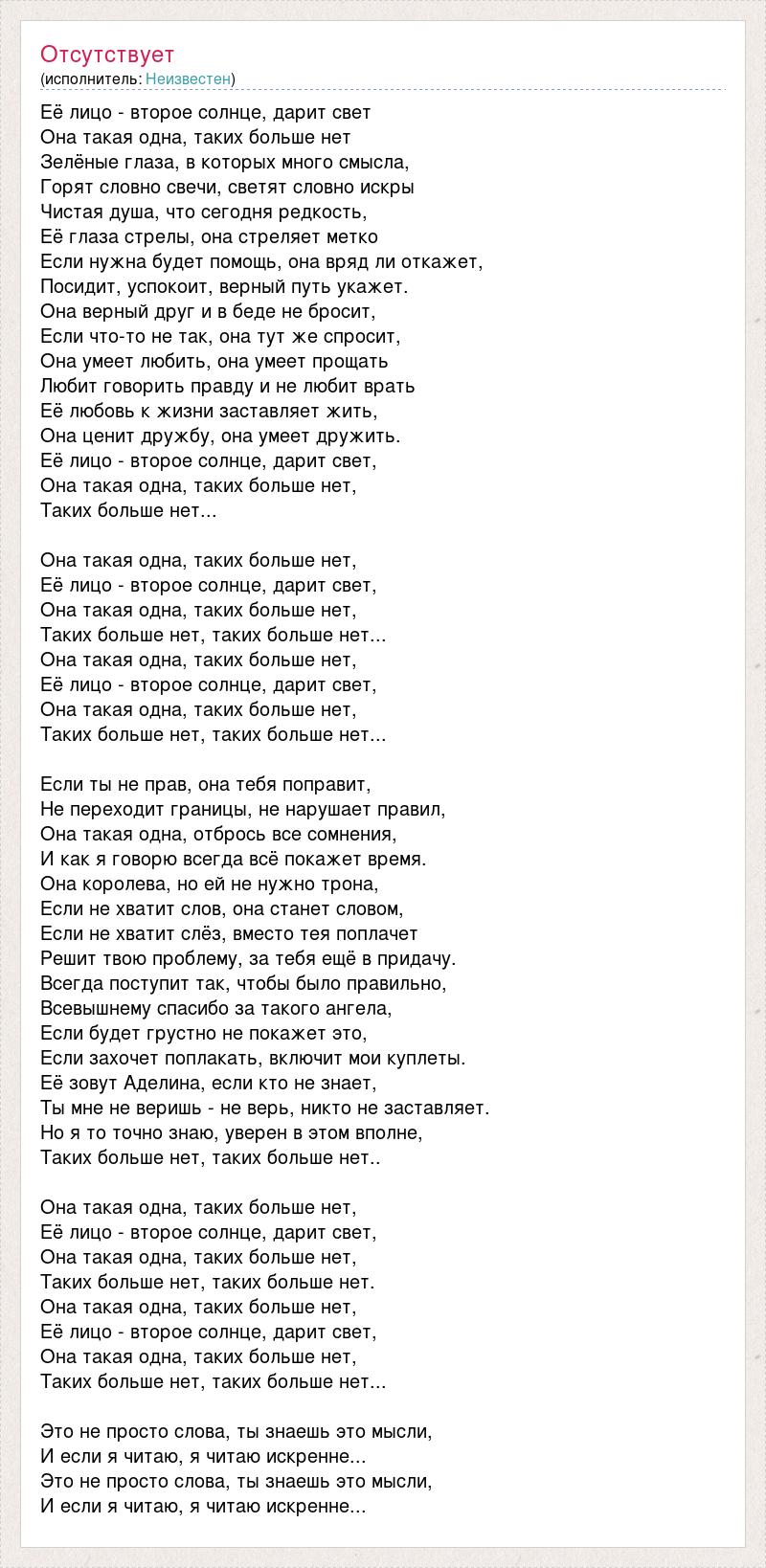 Её лицо - второе солнце, дарит свет Она такая одна, таких больше нет Зелёные глаза, в которых много смысла, Горят словно свечи, светят словно искры Чистая душа, что сегодня редкость, Её глаза стрелы, она стреляет метко Если нужна будет помощь, она вряд ли откажет, Посидит, успокоит, верный путь укажет. Она верный друг и в беде не бросит, Если что-то не так, она тут же спросит, Она умеет любить, она умеет прощать Любит говорить правду и не любит врать Её любовь к жизни заставляет жить, Она ценит дружбу, она умеет дружить. Её лицо - второе солнце, дарит свет, Она такая одна, таких больше нет, Таких больше нет... Она такая одна, таких больше нет, Её лицо - второе солнце, дарит свет, Она такая одна, таких больше нет, Таких больше нет, таких больше нет... Она такая одна, таких больше нет, Её лицо - второе солнце, дарит свет, Она такая одна, таких больше нет, Таких больше нет, таких больше нет... Если ты не прав, она тебя поправит, Не переходит границы, не нарушает правил, Она такая одна, отбрось все сомнения, И как я говорю всегда всё покажет время. Она королева, но ей не нужно трона, Если не хватит слов, она станет словом, Если не хватит слёз, вместо тея поплачет Решит твою проблему, за тебя ещё в придачу. Всегда поступит так, чтобы было правильно, Всевышнему спасибо за такого ангела, Если будет грустно не покажет это, Если захочет поплакать, включит мои куплеты. Её зовут Аделина, если кто не знает, Ты мне не веришь - не верь, никто не заставляет. Но я то точно знаю, уверен в этом вполне, Таких больше нет, таких больше нет.. Она такая одна, таких больше нет, Её лицо - второе солнце, дарит свет, Она такая одна, таких больше нет, Таких больше нет, таких больше нет. Она такая одна, таких больше нет, Её лицо - второе солнце, дарит свет, Она такая одна, таких больше нет, Таких больше нет, таких больше нет... Это не просто слова, ты знаешь это мысли, И если я читаю, я читаю искренне... Это не просто слова, ты знаешь это мысли, И если я читаю, я читаю искренне...