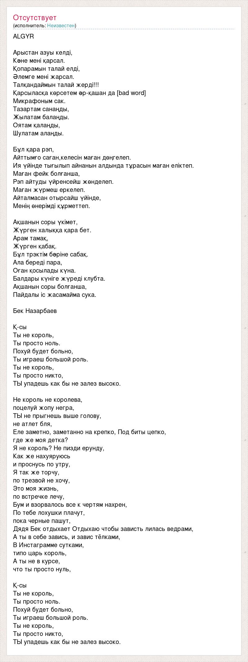 ALGYR Арыстан азуы келді, Кəне мені қарсал. Қопарамын талай елді, Əлемге мені жарсал. Талқандаймын талай жерді!!! Қарсыласқа көрсетем əр-қашан да [bad word] Микрафоным сак. Тазартам санаңды, Жылатам балаңды. Оятам қалаңды, Шулатам алаңды. Бұл қара рэп, Айттымғо саған,келесін маған дөңгелеп. Ия үйінде тығылып айнанын алдында тұрасын маған еліктеп. Маған фейк болғанша, Рэп айтуды үйренсейш жөнделеп. Маған жүрмеш еркелеп. Айталмасан отырсайш үйінде, Менің өнерімді құрметтеп. Ақшанын соры үкімет, Жүрген халыққа қара бет. Арам тамақ, Жүрген қабақ. Бұл трэктім бəріне сабақ. Ала береді пара, Оған қосылады күна. Балдары күніге жүреді клубта. Ақшанын соры болғанша, Пайдалы іс жасамайма сука. Бек Назарбаев Қ-сы Ты не король, Ты просто ноль. Похуй будет больно, Ты играеш большой роль. Ты не король, Ты просто никто, ТЫ упадешь как бы не залез высоко. Не король не королева, поцелуй жопу негра, ТЫ не прыгнешь выше голову, не атлет бля, Еле заметно, заметанно на крепко, Под биты цепко, где же моя детка? Я не король? Не пизди ерунду, Как же нахуяруюсь и проснусь по утру, Я так же торчу, по трезвой не хочу, Это моя жизнь, по встречке лечу, Бум и взорвалось все к чертям нахрен, По тебе лохушки плачут, пока черные пашут, Дядя Бек отдыхает Отдыхаю чтобы зависть лилась ведрами, А ты в себе завись, и завис тёлками, В Инстаграмме сутками, типо царь король, А ты не в курсе, что ты просто нуль, Қ-сы Ты не король, Ты просто ноль. Похуй будет больно, Ты играеш большой роль. Ты не король, Ты просто никто, ТЫ упадешь как бы не залез высоко.
