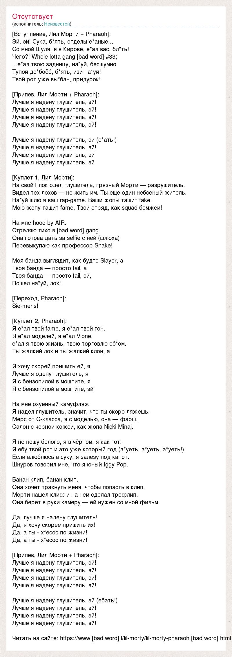 [Вступление, Лил Морти + Pharaoh]: Эй, эй! Сука, б*ять, отделы е*аные... Со мной Шуля, я в Кирове, е*ал вас, бл*ть! Чего?! Whole lotta gang [bad word] #33; ...е*ал твою задницу, на*уй, бесшумно Тупой до*боёб, б*ять, изи на*уй! Твой рот уже вы*бан, придурок! [Припев, Лил Морти + Pharaoh]: Лучше я надену глушитель, эй! Лучше я надену глушитель, эй! Лучше я надену глушитель, эй! Лучше я надену глушитель, эй! Лучше я надену глушитель, эй (е*ать!) Лучше я надену глушитель, эй! Лучше я надену глушитель, эй Лучше я надену глушитель, эй [Куплет 1, Лил Морти]: На свой Глок одел глушитель, грязный Морти — разрушитель. Видел тех лохов — не жить им. Ты еще один небсеный житель. На*уй шлю я ваш rap-game. Ваши жопы тащит fake. Мою жопу тащит fame. Твой отряд, как squad бомжей! На мне hood by AIR. Стреляю тихо в [bad word] gang. Она готова дать за selfie с ней (шлюха) Перевыкупаю как профессор Snake! Моя банда выглядит, как будто Slayer, а Твоя банда — просто fail, а Твоя банда — просто fail, эй, Пошел на*уй, лох! [Переход, Pharaoh]: Sie-mens! [Куплет 2, Pharaoh]: Я е*ал твой fame, я е*ал твой гон. Я е*ал моделей, я е*ал Vlone. е*ал я твою жизнь, твою торговлю еб*ом. Ты жалкий лох и ты жалкий клон, а Я хочу скорей пришить ей, я Лучше я одену глушитель, я Я с бензопилой в мошпите, я Я с бензопилой в мошпите, эй На мне охуенный камуфляж Я надел глушитель, значит, что ты скоро ляжешь. Мерс от С-класса, я с моделью, она — фарш. Салон с черной кожей, как жопа Nicki Minaj. Я не ношу белого, я в чёрном, я как гот. Я ебу твой рот и это уже который год (а*уеть, а*уеть, а*уеть!) Если влюблюсь в суку, я залезу под капот. Шнуров говорил мне, что я юный Iggy Pop. Банан клип, банан клип. Она хочет трахнуть меня, чтобы попасть в клип. Морти нашел клиф и на нем сделал трефлип. Она берет в руки камеру — ей нужен со мной фильм. Да, лучше я надену глушитель! Да, я хочу скорее пришить их! Да, а ты - х*есос по жизни! Да, а ты - х*есос по жизни! [Припев, Лил Морти + Pharaoh]: Лучше я надену глушитель, эй! Лучше я надену глушитель, эй! Лучше я надену глушитель, эй! Лучше я надену глушитель, эй! Лучше я надену глушитель, эй (ебать!) Лучше я надену глушитель, эй! Лучше я надену глушитель, эй! Лучше я надену глушитель, эй! Читать на сайте: https://www [bad word] l/lil-morty/lil-morty-pharaoh [bad word] html