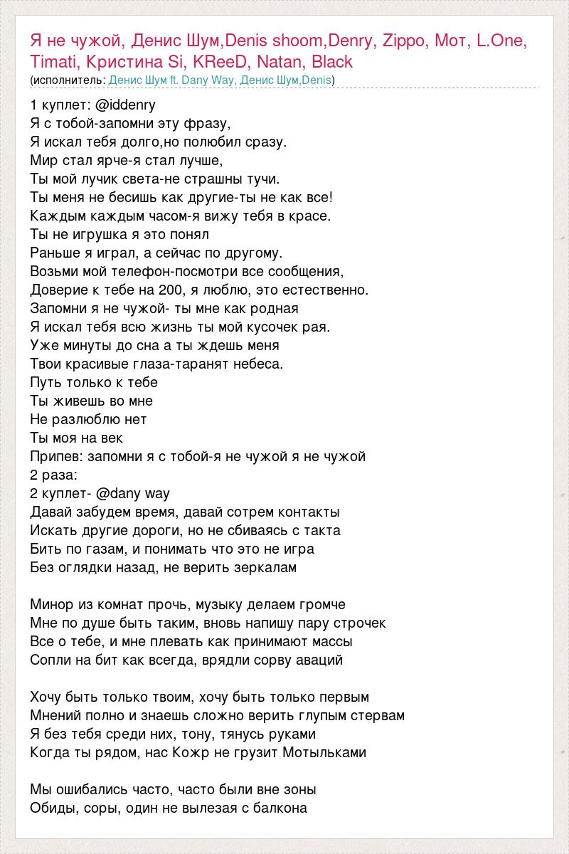 1 куплет: @iddenry Я с тобой-запомни эту фразу, Я искал тебя долго,но полюбил сразу. Мир стал ярче-я стал лучше, Ты мой лучик света-не страшны тучи. Ты меня не бесишь как другие-ты не как все! Каждым каждым часом-я вижу тебя в красе. Ты не игрушка я это понял Раньше я играл, а сейчас по другому. Возьми мой телефон-посмотри все сообщения, Доверие к тебе на 200, я люблю, это естественно. Запомни я не чужой- ты мне как родная Я искал тебя всю жизнь ты мой кусочек рая. Уже минуты до сна а ты ждешь меня Твои красивые глаза-таранят небеса. Путь только к тебе Ты живешь во мне Не разлюблю нет Ты моя на век Припев: запомни я с тобой-я не чужой я не чужой 2 раза: 2 куплет- @dany way Давай забудем время, давай сотрем контакты Искать другие дороги, но не сбиваясь с такта Бить по газам, и понимать что это не игра Без оглядки назад, не верить зеркалам Минор из комнат прочь, музыку делаем громче Мне по душе быть таким, вновь напишу пару строчек Все о тебе, и мне плевать как принимают массы Сопли на бит как всегда, врядли сорву аваций Хочу быть только твоим, хочу быть только первым Мнений полно и знаешь сложно верить глупым стервам Я без тебя среди них, тону, тянусь руками Когда ты рядом, нас Кожр не грузит Мотыльками Мы ошибались часто, часто были вне зоны Обиды, соры, один не вылезая с балкона