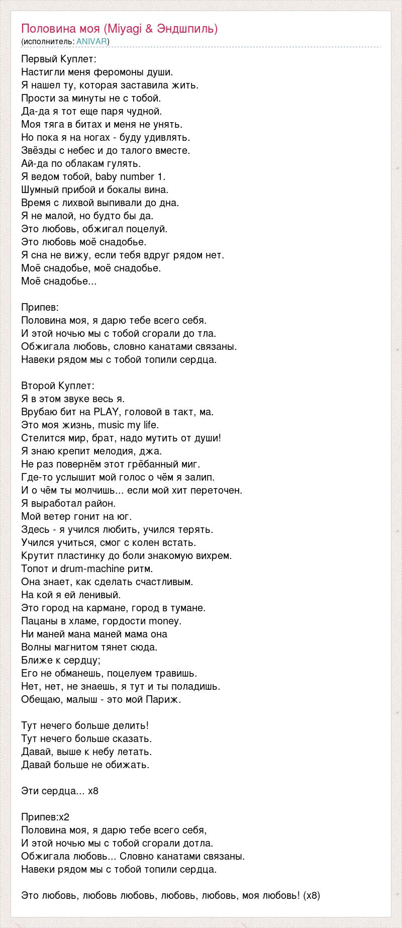Первый Куплет: Настигли меня феромоны души. Я нашел ту, которая заставила жить. Прости за минуты не с тобой. Да-да я тот еще паря чудной. Моя тяга в битах и меня не унять. Но пока я на ногах - буду удивлять. Звёзды с небес и до талого вместе. Ай-да по облакам гулять. Я ведом тобой, baby number 1. Шумный прибой и бокалы вина. Время с лихвой выпивали до дна. Я не малой, но будто бы да. Это любовь, обжигал поцелуй. Это любовь моё снадобье. Я сна не вижу, если тебя вдруг рядом нет. Моё снадобье, моё снадобье. Моё снадобье... Припев: Половина моя, я дарю тебе всего себя. И этой ночью мы с тобой сгорали до тла. Обжигала любовь, словно канатами связаны. Навеки рядом мы с тобой топили сердца. Второй Куплет: Я в этом звуке весь я. Врубаю бит на PLAY, головой в такт, ма. Это моя жизнь, music my life. Стелится мир, брат, надо мутить от души! Я знаю крепит мелодия, джа. Не раз повернём этот грёбанный миг. Где-то услышит мой голос о чём я залип. И о чём ты молчишь... если мой хит переточен. Я выработал район. Мой ветер гонит на юг. Здесь - я учился любить, учился терять. Учился учиться, смог с колен встать. Крутит пластинку до боли знакомую вихрем. Топот и drum-machine ритм. Она знает, как сделать счастливым. На кой я ей ленивый. Это город на кармане, город в тумане. Пацаны в хламе, гордости money. Ни маней мана маней мама она Волны магнитом тянет сюда. Ближе к сердцу; Его не обманешь, поцелуем травишь. Нет, нет, не знаешь, я тут и ты поладишь. Обещаю, малыш - это мой Париж. Тут нечего больше делить! Тут нечего больше сказать. Давай, выше к небу летать. Давай больше не обижать. Эти сердца... x8 Припев:x2 Половина моя, я дарю тебе всего себя, И этой ночью мы с тобой сгорали дотла. Обжигала любовь... Словно канатами связаны. Навеки рядом мы с тобой топили сердца. Это любовь, любовь любовь, любовь, любовь, моя любовь! (х8)