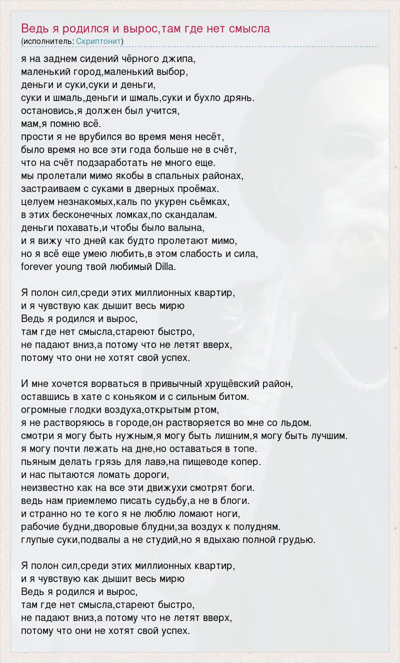 я на заднем сидений чёрного джипа, маленький город,маленький выбор, деньги и суки,суки и деньги, суки и шмаль,деньги и шмаль,суки и бухло дрянь. остановись,я должен был учится, мам,я помню всё. прости я не врубился во время меня несёт, было время но все эти года больше не в счёт, что на счёт подзаработать не много еще. мы пролетали мимо якобы в спальных районах, застраиваем с суками в дверных проёмах. целуем незнакомых,каль по укурен сьёмках, в этих бесконечных ломках,по скандалам. деньги похавать,и чтобы было валына, и я вижу что дней как будто пролетают мимо, но я всё еще умею любить,в этом слабость и сила, forever young твой любимый Dilla. Я полон сил,среди этих миллионных квартир, и я чувствую как дышит весь мирю Ведь я родился и вырос, там где нет смысла,стареют быстро, не падают вниз,а потому что не летят вверх, потому что они не хотят свой успех. И мне хочется ворваться в привычный хрущёвский район, оставшись в хате с коньяком и с сильным битом. огромные глодки воздуха,открытым ртом, я не растворяюсь в городе,он растворяется во мне со льдом. смотри я могу быть нужным,я могу быть лишним,я могу быть лучшим. я могу почти лежать на дне,но оставаться в топе. пьяным делать грязь для лавэ,на пищеводе копер. и нас пытаются ломать дороги, неизвестно как на все эти движухи смотрят боги. ведь нам приемлемо писать судьбу,а не в блоги. и странно но те кого я не люблю ломают ноги, рабочие будни,дворовые блудни,за воздух к полудням. глупые суки,подвалы а не студий,но я вдыхаю полной грудью. Я полон сил,среди этих миллионных квартир, и я чувствую как дышит весь мирю Ведь я родился и вырос, там где нет смысла,стареют быстро, не падают вниз,а потому что не летят вверх, потому что они не хотят свой успех.