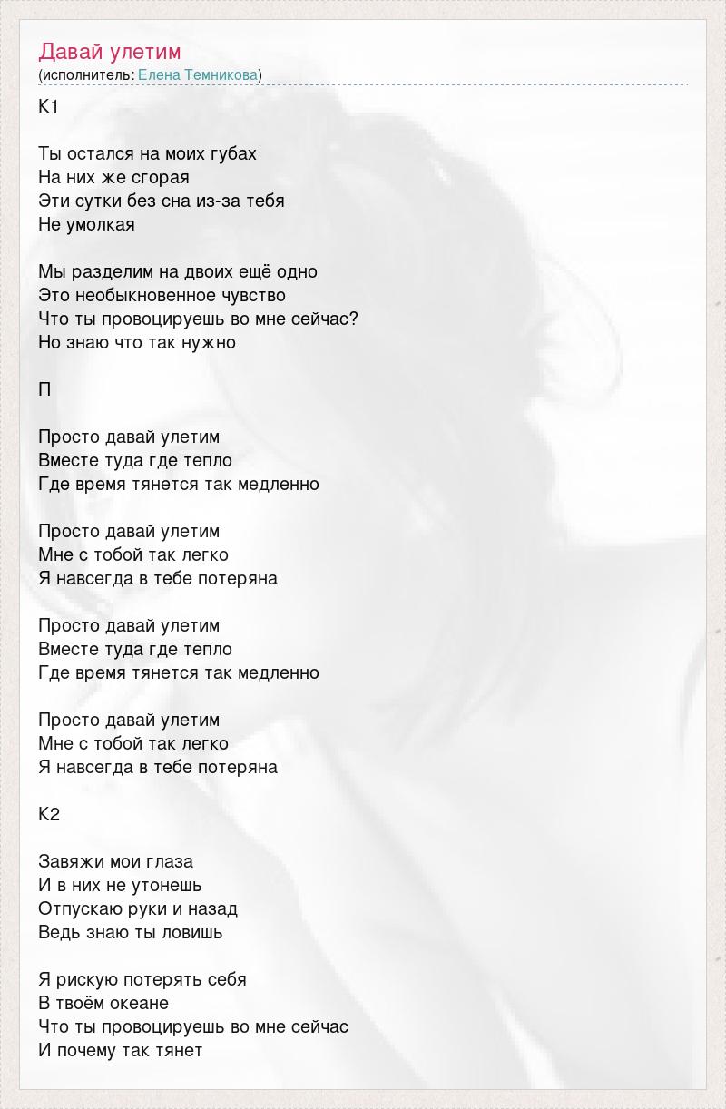 К1 Ты остался на моих губах На них же сгорая Эти сутки без сна из-за тебя Не умолкая Мы разделим на двоих ещё одно Это необыкновенное чувство Что ты провоцируешь во мне сейчас? Но знаю что так нужно П Просто давай улетим Вместе туда где тепло Где время тянется так медленно Просто давай улетим Мне с тобой так легко Я навсегда в тебе потеряна Просто давай улетим Вместе туда где тепло Где время тянется так медленно Просто давай улетим Мне с тобой так легко Я навсегда в тебе потеряна К2 Завяжи мои глаза И в них не утонешь Отпускаю руки и назад Ведь знаю ты ловишь Я рискую потерять себя В твоём океане Что ты провоцируешь во мне сейчас И почему так тянет