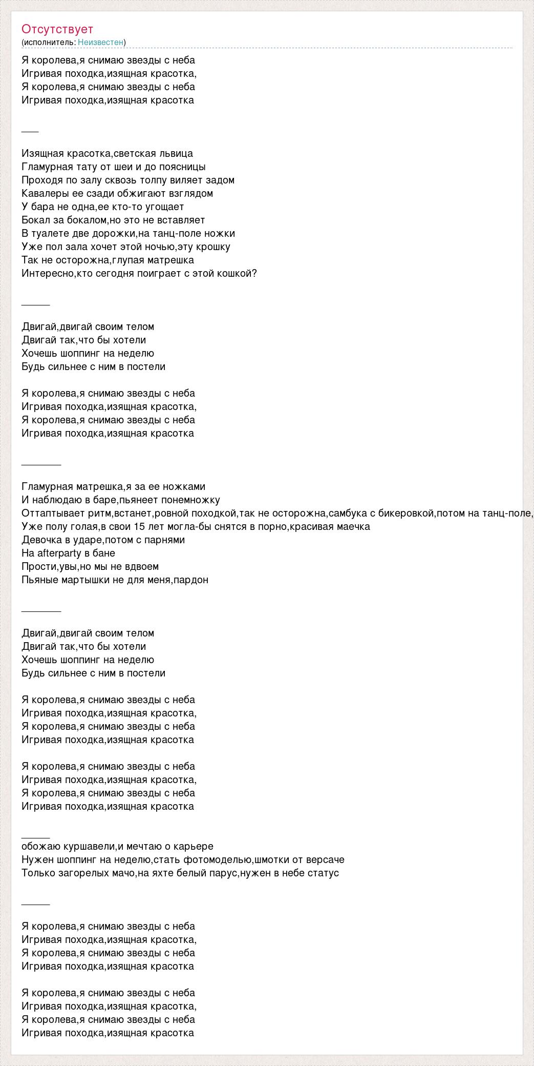 Я королева,я снимаю звезды с неба Игривая походка,изящная красотка, Я королева,я снимаю звезды с неба Игривая походка,изящная красотка ___ Изящная красотка,светская львица Гламурная тату от шеи и до поясницы Проходя по залу сквозь толпу виляет задом Кавалеры ее сзади обжигают взглядом У бара не одна,ее кто-то угощает Бокал за бокалом,но это не вставляет В туалете две дорожки,на танц-поле ножки Уже пол зала хочет этой ночью,эту крошку Так не осторожна,глупая матрешка Интересно,кто сегодня поиграет с этой кошкой? _____ Двигай,двигай своим телом Двигай так,что бы хотели Хочешь шоппинг на неделю Будь сильнее с ним в постели Я королева,я снимаю звезды с неба Игривая походка,изящная красотка, Я королева,я снимаю звезды с неба Игривая походка,изящная красотка _______ Гламурная матрешка,я за ее ножками И наблюдаю в баре,пьянеет понемножку Оттаптывает ритм,встанет,ровной походкой,так не осторожна,самбука с бикеровкой,потом на танц-поле, Уже полу голая,в свои 15 лет могла-бы снятся в порно,красивая маечка Девочка в ударе,потом с парнями На afterparty в бане Прости,увы,но мы не вдвоем Пьяные мартышки не для меня,пардон _______ Двигай,двигай своим телом Двигай так,что бы хотели Хочешь шоппинг на неделю Будь сильнее с ним в постели Я королева,я снимаю звезды с неба Игривая походка,изящная красотка, Я королева,я снимаю звезды с неба Игривая походка,изящная красотка Я королева,я снимаю звезды с неба Игривая походка,изящная красотка, Я королева,я снимаю звезды с неба Игривая походка,изящная красотка _____ обожаю куршавели,и мечтаю о карьере Нужен шоппинг на неделю,стать фотомоделью,шмотки от версаче Только загорелых мачо,на яхте белый парус,нужен в небе статус _____ Я королева,я снимаю звезды с неба Игривая походка,изящная красотка, Я королева,я снимаю звезды с неба Игривая походка,изящная красотка Я королева,я снимаю звезды с неба Игривая походка,изящная красотка, Я королева,я снимаю звезды с неба Игривая походка,изящная красотка