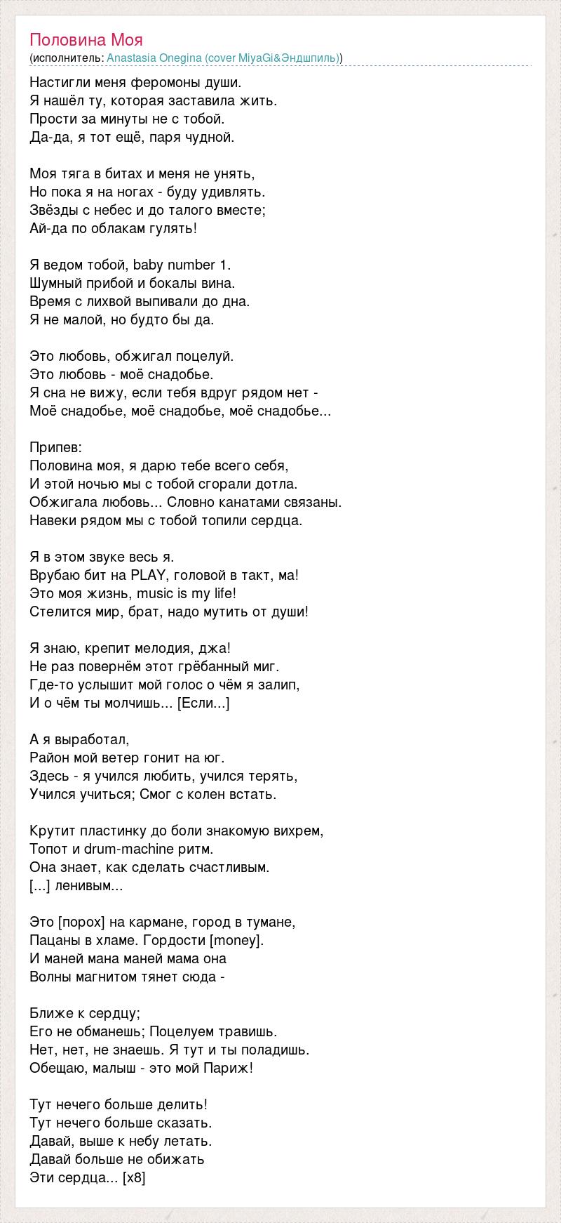 Настигли меня феромоны души. Я нашёл ту, которая заставила жить. Прости за минуты не с тобой. Да-да, я тот ещё, паря чудной. Моя тяга в битах и меня не унять, Но пока я на ногах - буду удивлять. Звёзды с небес и до талого вместе; Ай-да по облакам гулять! Я ведом тобой, baby number 1. Шумный прибой и бокалы вина. Время с лихвой выпивали до дна. Я не малой, но будто бы да. Это любовь, обжигал поцелуй. Это любовь - моё снадобье. Я сна не вижу, если тебя вдруг рядом нет - Моё снадобье, моё снадобье, моё снадобье... Припев: Половина моя, я дарю тебе всего себя, И этой ночью мы с тобой сгорали дотла. Обжигала любовь... Словно канатами связаны. Навеки рядом мы с тобой топили сердца. Я в этом звуке весь я. Врубаю бит на PLAY, головой в такт, ма! Это моя жизнь, music is my life! Стелится мир, брат, надо мутить от души! Я знаю, крепит мелодия, джа! Не раз повернём этот грёбанный миг. Где-то услышит мой голос о чём я залип, И о чём ты молчишь... [Если...] А я выработал, Район мой ветер гонит на юг. Здесь - я учился любить, учился терять, Учился учиться; Смог с колен встать. Крутит пластинку до боли знакомую вихрем, Топот и drum-machine ритм. Она знает, как сделать счастливым. [...] ленивым... Это [порох] на кармане, город в тумане, Пацаны в хламе. Гордости [money]. И маней мана маней мама она Волны магнитом тянет сюда - Ближе к сердцу; Его не обманешь; Поцелуем травишь. Нет, нет, не знаешь. Я тут и ты поладишь. Обещаю, малыш - это мой Париж! Тут нечего больше делить! Тут нечего больше сказать. Давай, выше к небу летать. Давай больше не обижать Эти сердца... [x8]