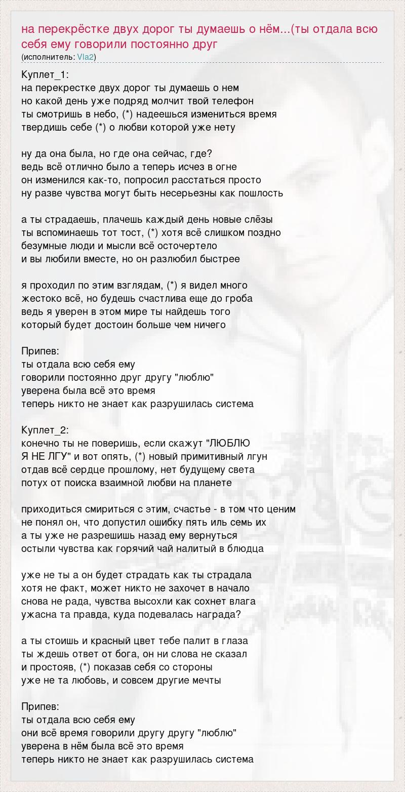 Куплет_1: на перекрестке двух дорог ты думаешь о нем но какой день уже подряд молчит твой телефон ты смотришь в небо, (*) надеешься измениться время твердишь себе (*) о любви которой уже нету ну да она была, но где она сейчас, где? ведь всё отлично было а теперь исчез в огне он изменился как-то, попросил расстаться просто ну разве чувства могут быть несерьезны как пошлость а ты страдаешь, плачешь каждый день новые слёзы ты вспоминаешь тот тост, (*) хотя всё слишком поздно безумные люди и мысли всё осточертело и вы любили вместе, но он разлюбил быстрее я проходил по этим взглядам, (*) я видел много жестоко всё, но будешь счастлива еще до гроба ведь я уверен в этом мире ты найдешь того который будет достоин больше чем ничего Припев: ты отдала всю себя ему говорили постоянно друг другу "люблю" уверена была всё это время теперь никто не знает как разрушилась система Куплет_2: конечно ты не поверишь, если скажут "ЛЮБЛЮ Я НЕ ЛГУ" и вот опять, (*) новый примитивный лгун отдав всё сердце прошлому, нет будущему света потух от поиска взаимной любви на планете приходиться смириться с этим, счастье - в том что ценим не понял он, что допустил ошибку пять иль семь их а ты уже не разрешишь назад ему вернуться остыли чувства как горячий чай налитый в блюдца уже не ты а он будет страдать как ты страдала хотя не факт, может никто не захочет в начало снова не рада, чувства высохли как сохнет влага ужасна та правда, куда подевалась награда? а ты стоишь и красный цвет тебе палит в глаза ты ждешь ответ от бога, он ни слова не сказал и простояв, (*) показав себя со стороны уже не та любовь, и совсем другие мечты Припев: ты отдала всю себя ему они всё время говорили другу другу "люблю" уверена в нём была всё это время теперь никто не знает как разрушилась система